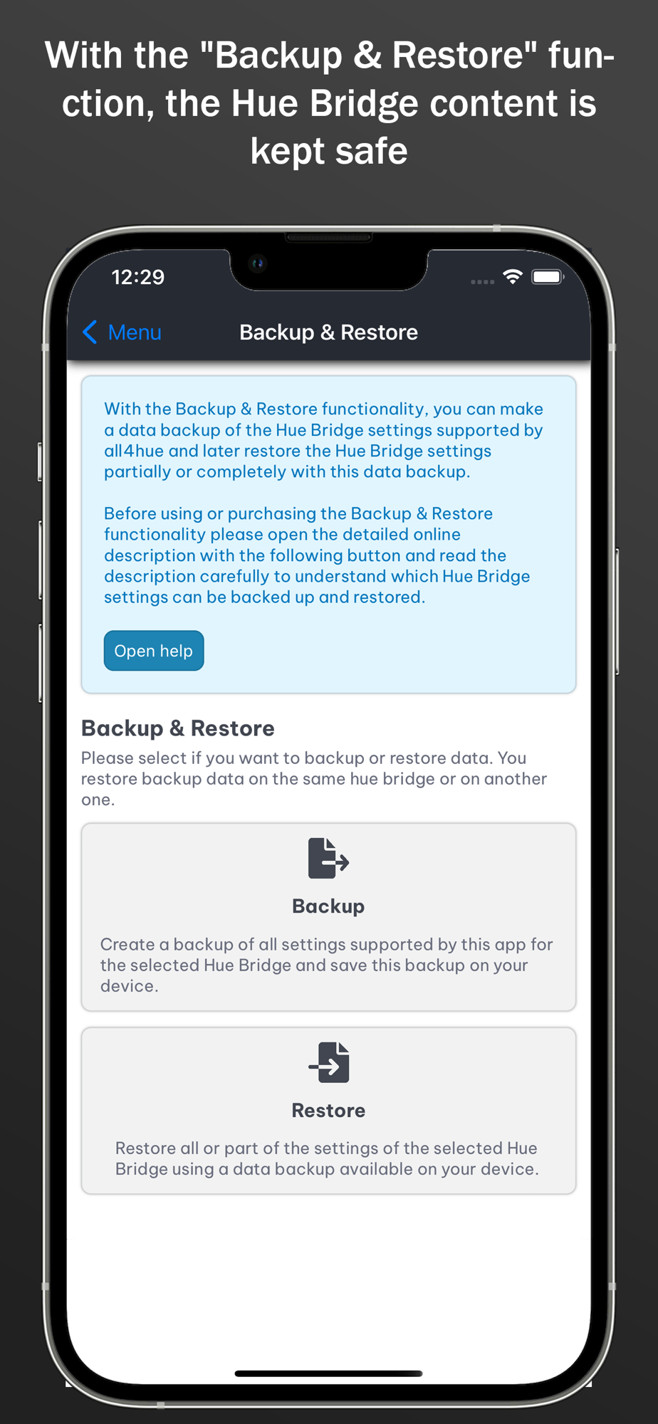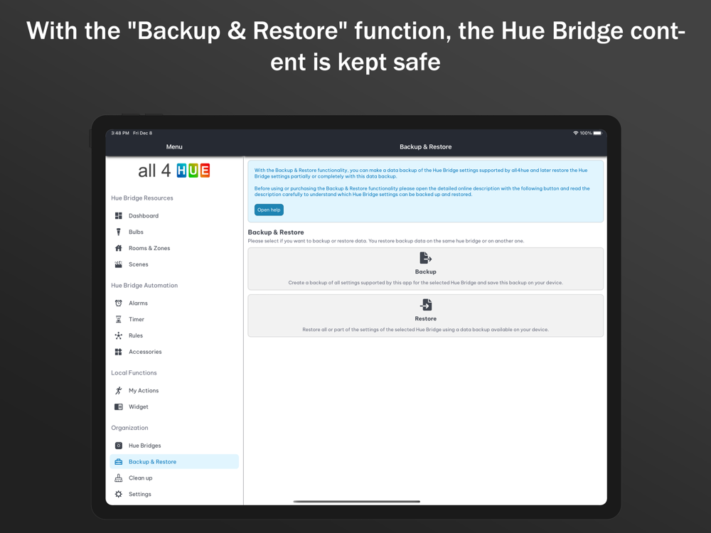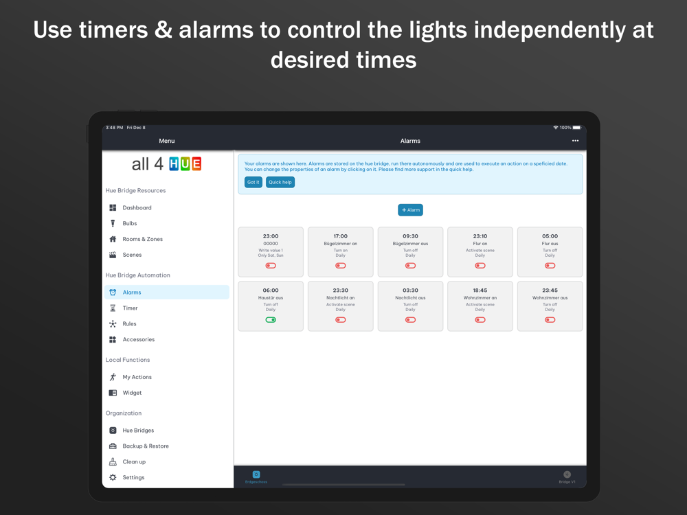 "all 4 hue" is the most comprehensive and best-rated app for Philips Hue. In addition to direct control of lights and rooms, this app is ideal for comprehensive automation of up to five Hue Bridges via timers, alarms and rules in combination with all available Philips Hue devices such as switches and sensors.