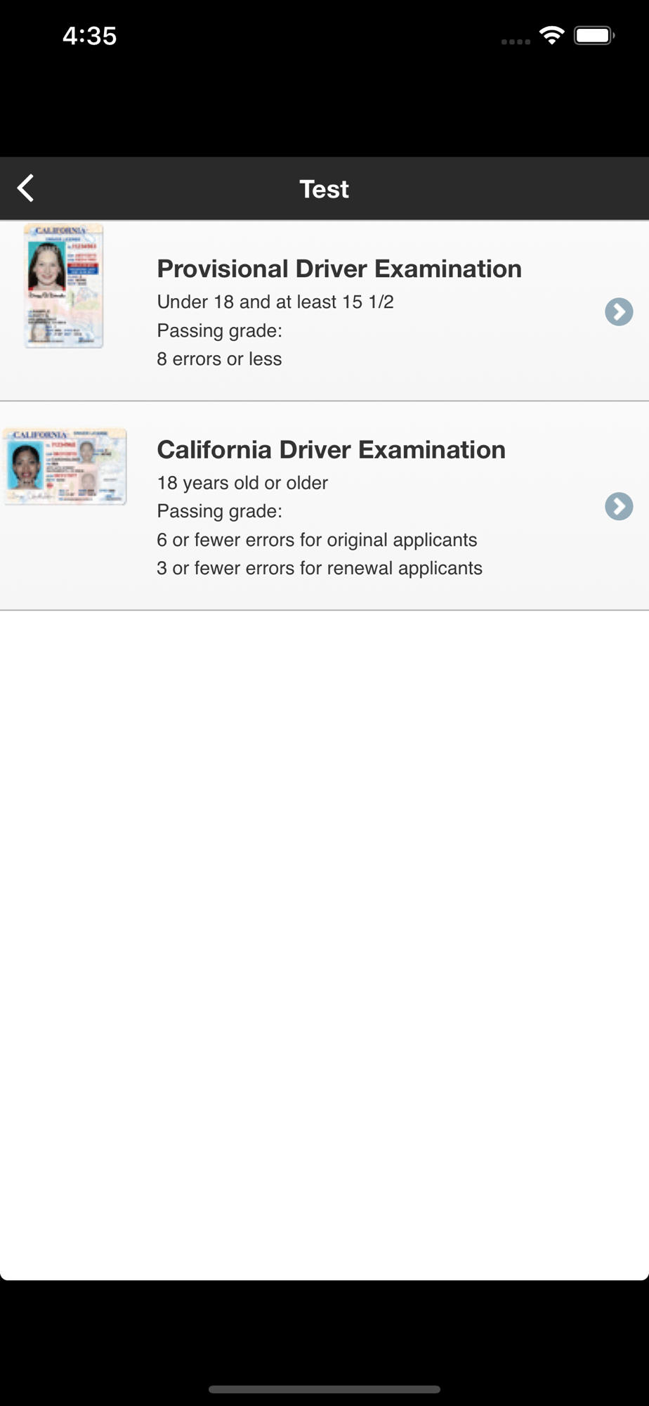 If you are 18 years old or older, you should take California Driver examination. There are 36 questions on the exam. Passing grade: 6 or fewer errors for original applicants, 3 or fewer errors for renewal applicants.