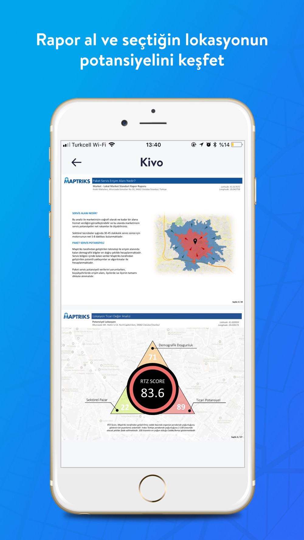 Advanced raporda ise standart raporda sunulan veri ve bilgilere ek olarak Kivo’nun aday lokasyona ve sektöre ilişkin detaylı uzman görüşü, il ve ilçe içerisindeki ticari potansiyel, mahalle ölçeğinde detaylı demografik yapı analizleri yer alır. Advance raporda yer alan en önemli değerlendirme ise, aday lokasyonunuza ait ticaret ve hizmet potansiyelini gösteren bir puanlama sunmasıdır.