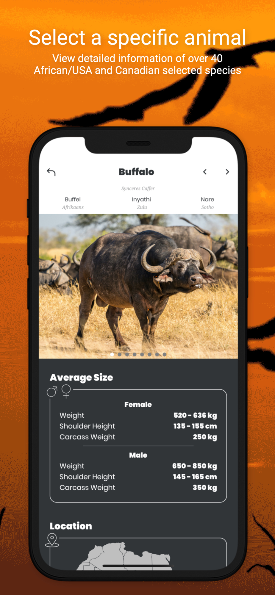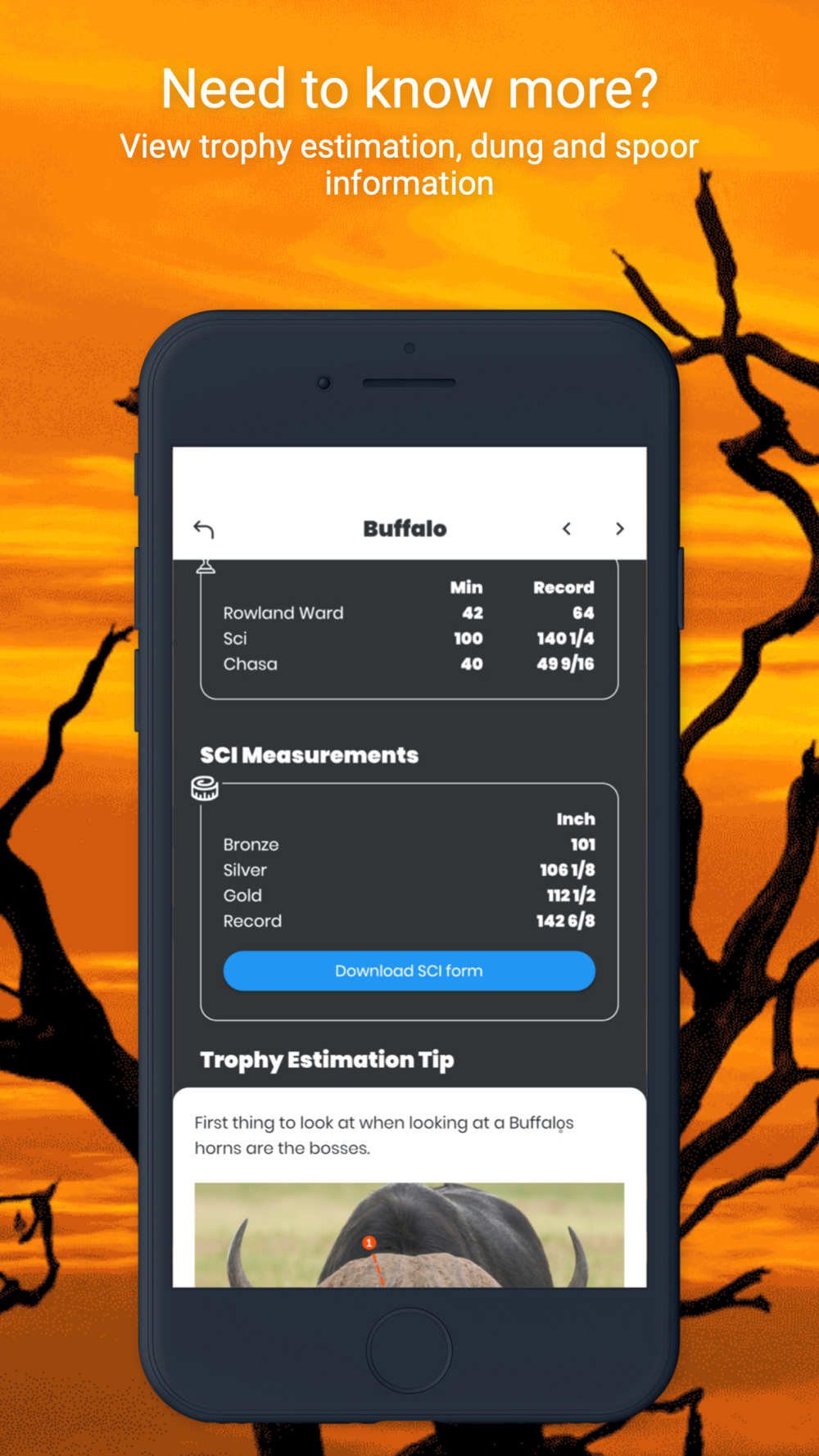 - Shot Placement Guide of 20 African Species with information on these species and even Trophy Estimation, Dung and Spoor information and pictures. (Black Wildebeest / White Tailed Gnu, Blesbuck, Blue Wildebeest / Brindeled Gnu, Buffalo, Bushbuck, Common Duiker, Eland, Gemsbok / Oryx, Giraffe, Impala, Kudu, Nyala, Plains Zebra, Red Hartebeest, Roan Antelope, Sable Antelope, Springbuck, Steenbok, Warthog, Waterbuck)