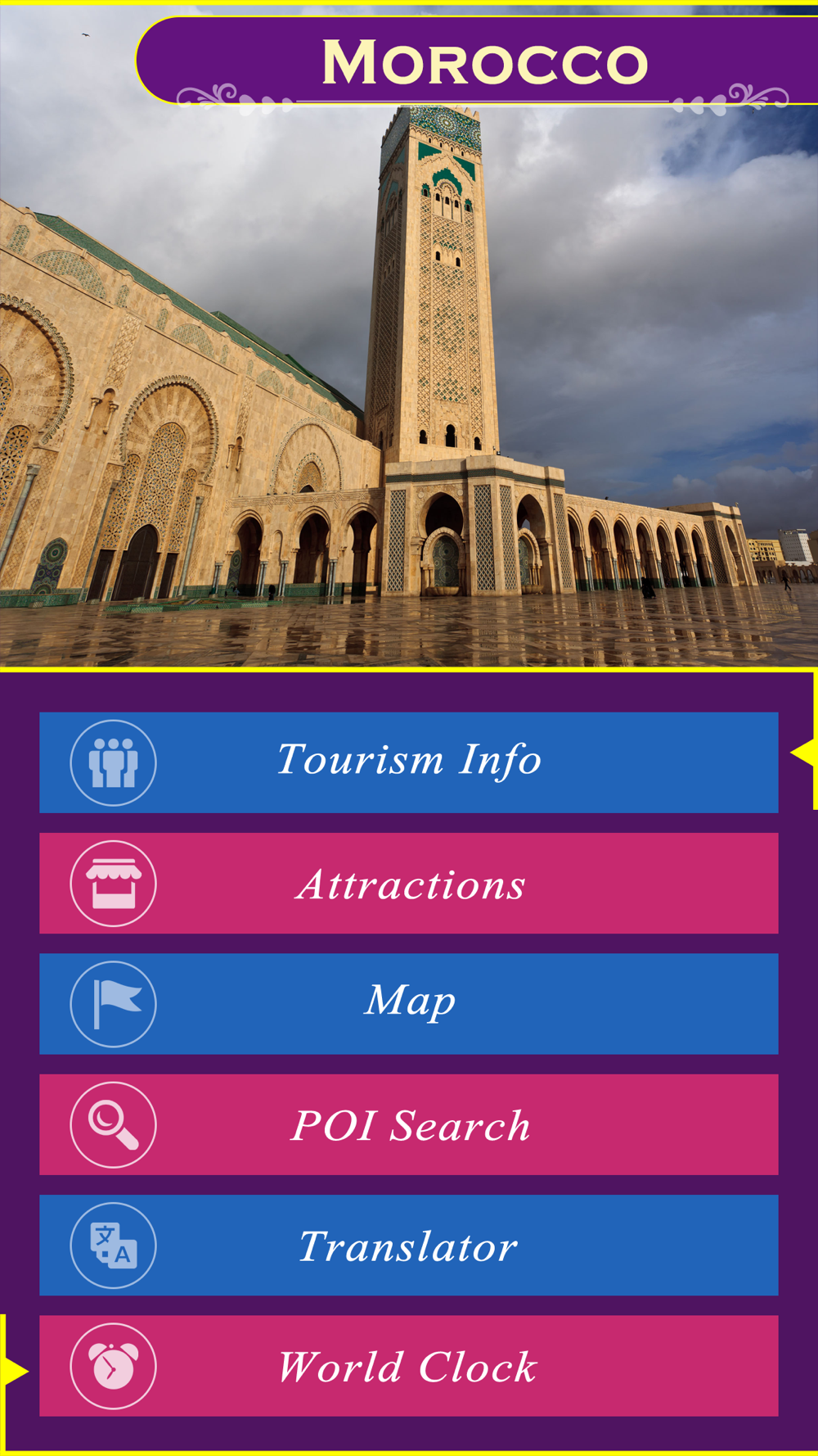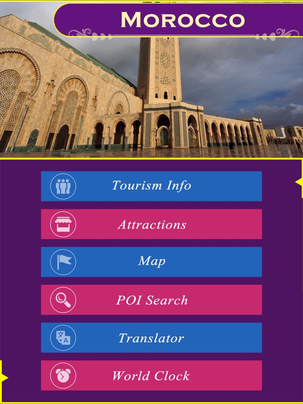 This is a premier iOS app catering to almost every information of Morocco. It provides up-to-date information of the Morocco like Tourism Info, Attractions, Map, POI Search, Translator & World Clock.