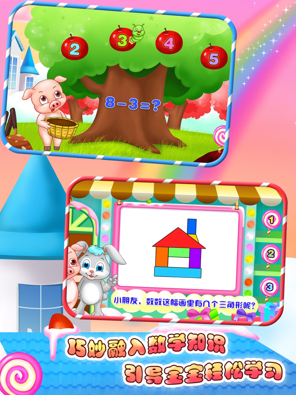 儿童教育学数学是专门针对宝宝们精心设计的学前教育游戏,通过生动有趣的游戏让宝宝边娱乐边学习数学,所涉及的数学内容包括认数字、学加法和识几何图形。