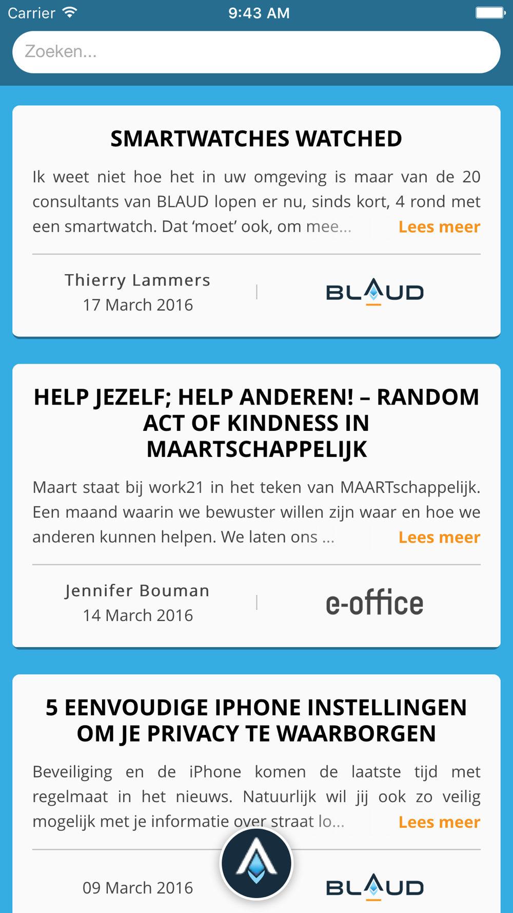 e-office, BLAUD en Work21 werken vanuit de e-office group samen om het Digital Workspace concept voor u te realiseren over de assen Mens, Organisatie en Techniek. Onze gezamenlijke expertisegebieden digitaal samenwerken en kennis delen, Enterprise Mobility, Security, Adoptie en verandermanagement zijn zoals u weet bijzonder dynamisch. Over deze onderwerpen wordt door zowel e-office, BLAUD als Work21 geblogd op de verschillende websites. Om deze constante stroom van relevante content nog beter aan u beschikbaar te stellen hebben wij onze 3 blogs en onze gezamenlijke podcast samengebracht in één efficiënte app genaamd ‘Newswire’. Samenwerken begint immers met kennisdelen, nietwaar?
