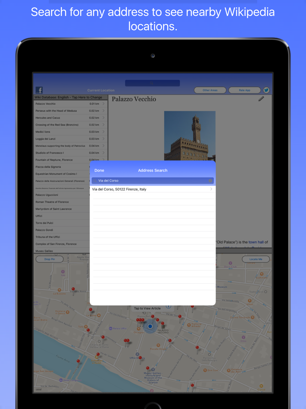 Florence Wiki Guide shows you all of the locations in Florence, Italy that have a Wikipedia page.