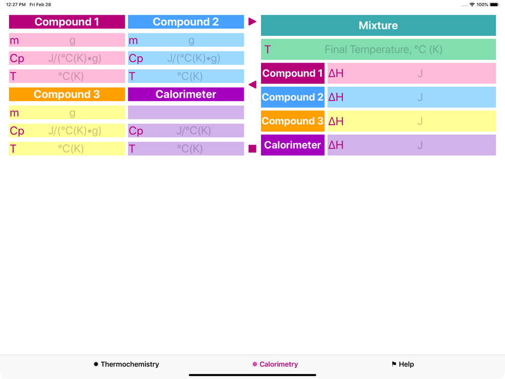 Calorimetry section provides means for evaluation of the heat capacity of calorimeter and for finding equilibrium temperature of mixed system. Forward arrow button sets the final temperature of the mixture. Backward arrow button sets missing temperature or heat capacity of one of the components. Enthalpy values show heat flow for each component.