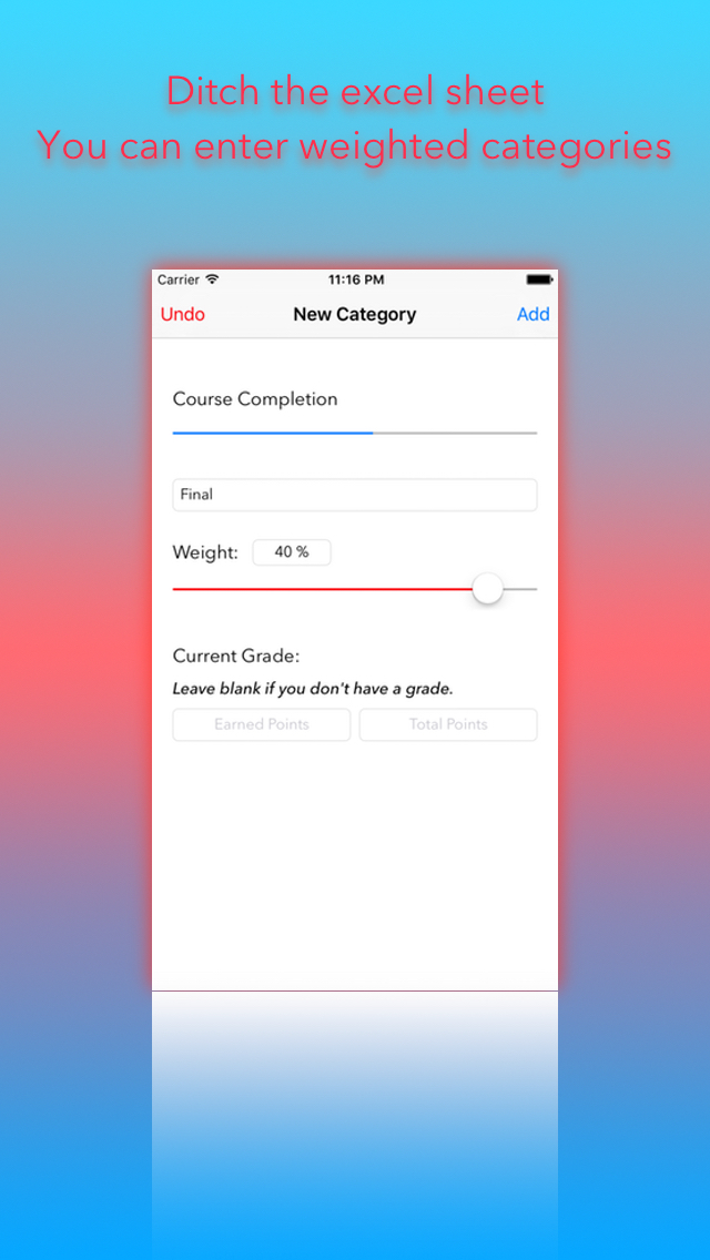 Tired of re-entering in all of your grades from the semester every time you want to check on your progress? Exhausted from calculating the weights of different categories and how they factor into your overall grade? Need to know what to get on that final exam to get the grade you want?
