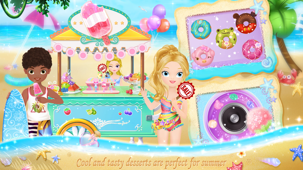 Open the game, and you'll see this fantastic place! Can't wait to play, huh? Take it easy, sweetie. Let's get Libby changed first. Walk into the fashion house, choose your favorite outfits from the right side, and at the bottom you can invite some adorable animals to the room. All right, let's head out to the endless fun now. Well, it's too hot outside, if only there is a hand fan. Why not make one of your own? First, you gotta put the frames in the right places, and then select your favorite fan leaves, guards and a pendant. Want the fan to be even more special? Then decorate it. Bravo, let's embrace a cool holiday. If you like, you can be a real beach cooking chef, and treat your friends with delicious food. Feeling tired? Come on, it'll be an extraordinary experience to get a spa treatment by the sea. Popsicles, fishing, cotton candy, fishtail... Let's enjoy many more fun right now.