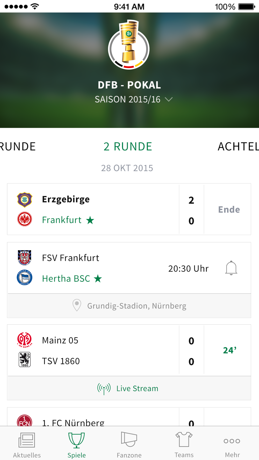Anpfiff für die offizielle DFB-Pokal App - so hast Du den traditionsreichen Pokalwettbewerb noch nie erlebt! Digital und interaktiv: Video-Highlights, Gaming, Fan-Voting und vieles mehr erwarten Dich in der neuen DFB-Pokal App - ein Muss für alle Fußball-Fans!