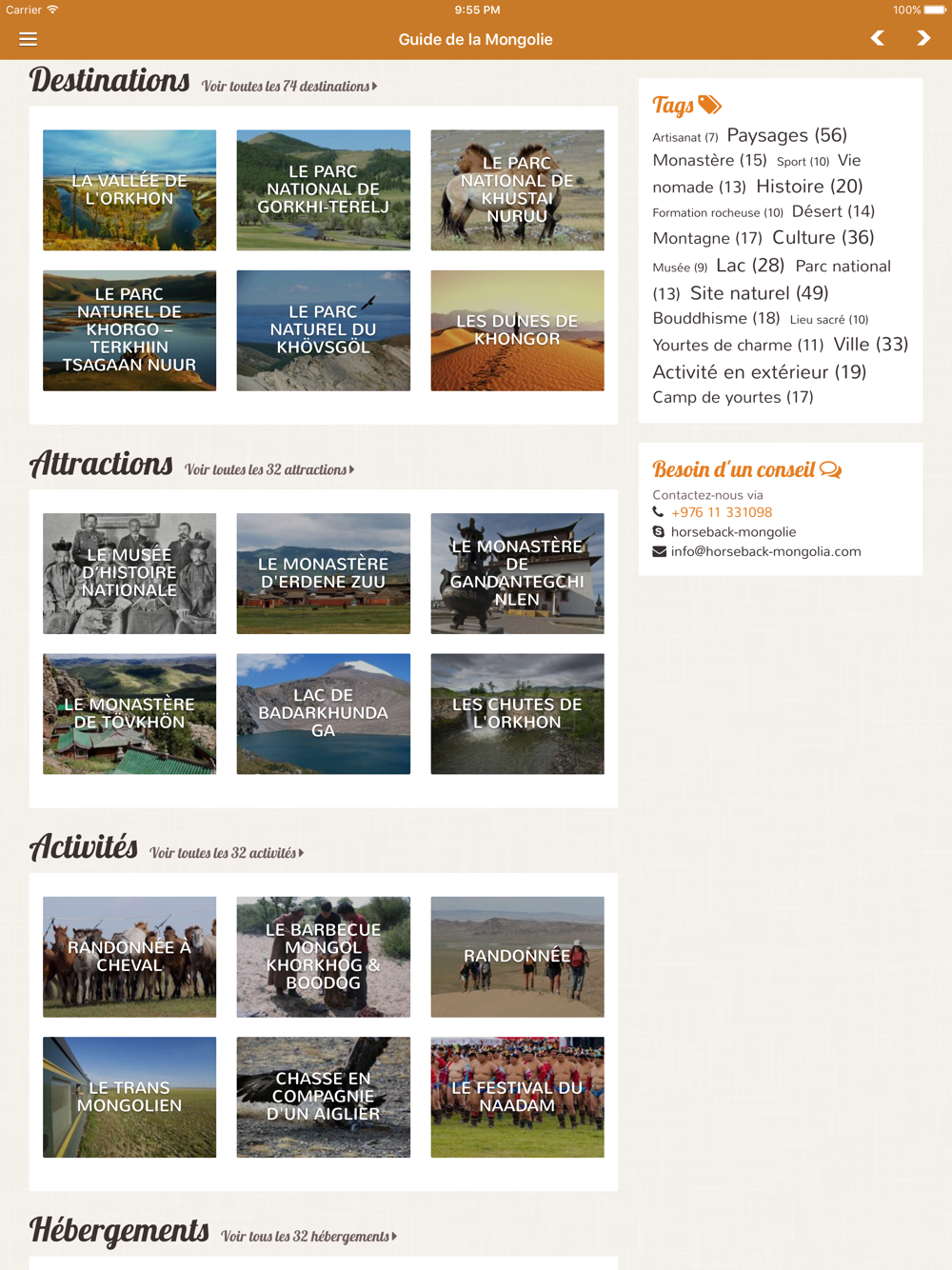 - Un guide ultra complet de la Mongolie qui centralise toutes les destinations à ne pas manquer : lieux, activités, restaurants, hébergement chez l’habitant, hôtels… Chaque fiche comprend une description exhaustive afin que l'endroit en question n'ait plus aucun secret pour vous !