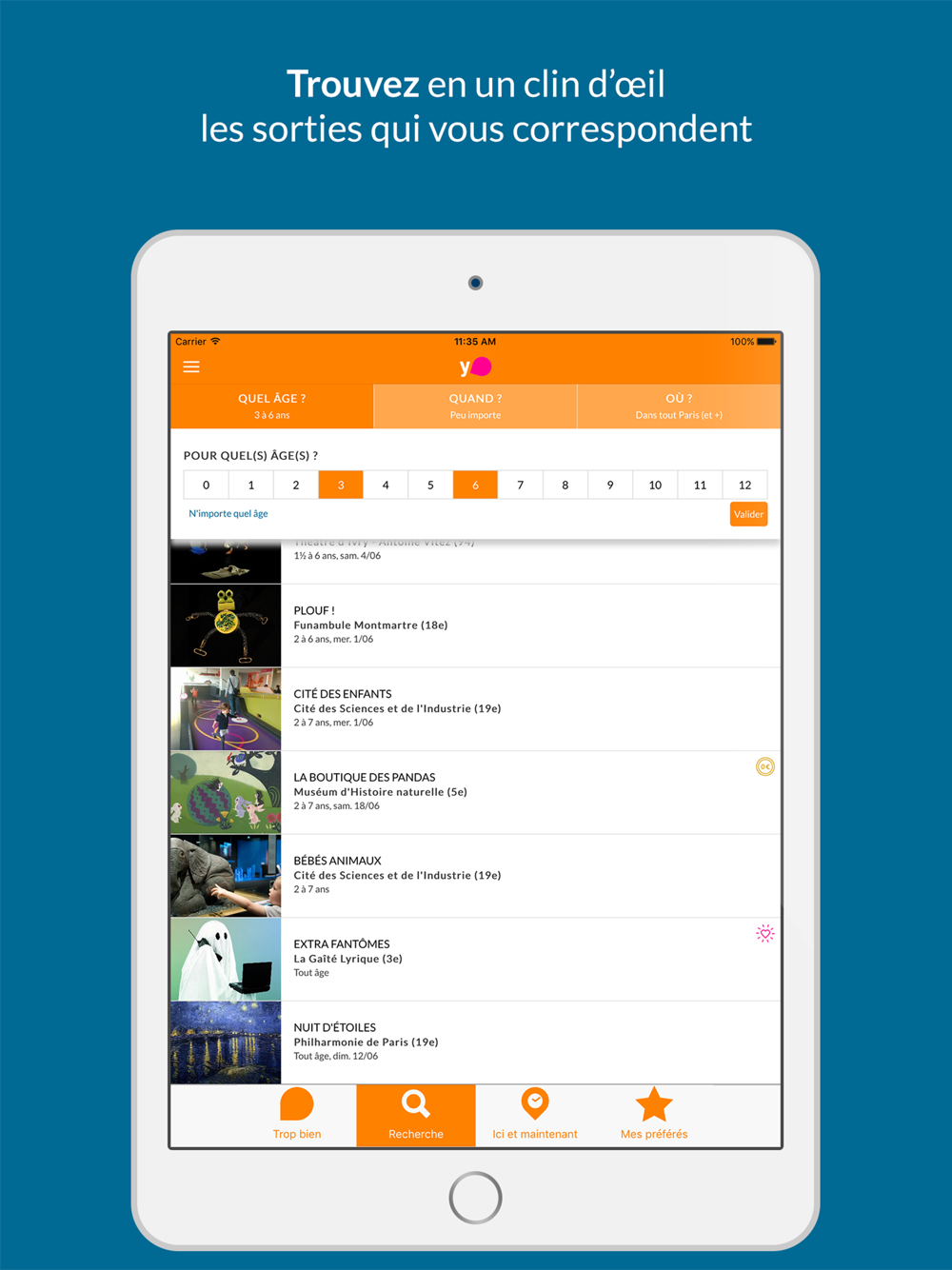 [+] sur les milliers de sorties pour enfants à Paris, YAMS n'en garde qu'une centaine à ne pas rater. Une sélection riche et pointue de sorties pour les 0-12 ans à Paris (et un peu au-delà) : spectacles, ateliers, expos, ciné, escapades, fêtes, festivals…