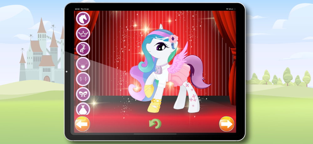 Choose the most cutest little pony, lovely hairstyles, long or shorter tails, fabulous dresses, cute modest outfits, spark jewelry pieces, fashionable shoes, chic leg covers and do not forget to add beautiful magic wings. The mysterious ponies can turn into an unicorn and fly using magic of angle wings, fine-tune your sweet little pony with one pair of those angle wings. You see the magic wings and watch your little cute pony turn into a gorgeous unicorn right before your eyes!
