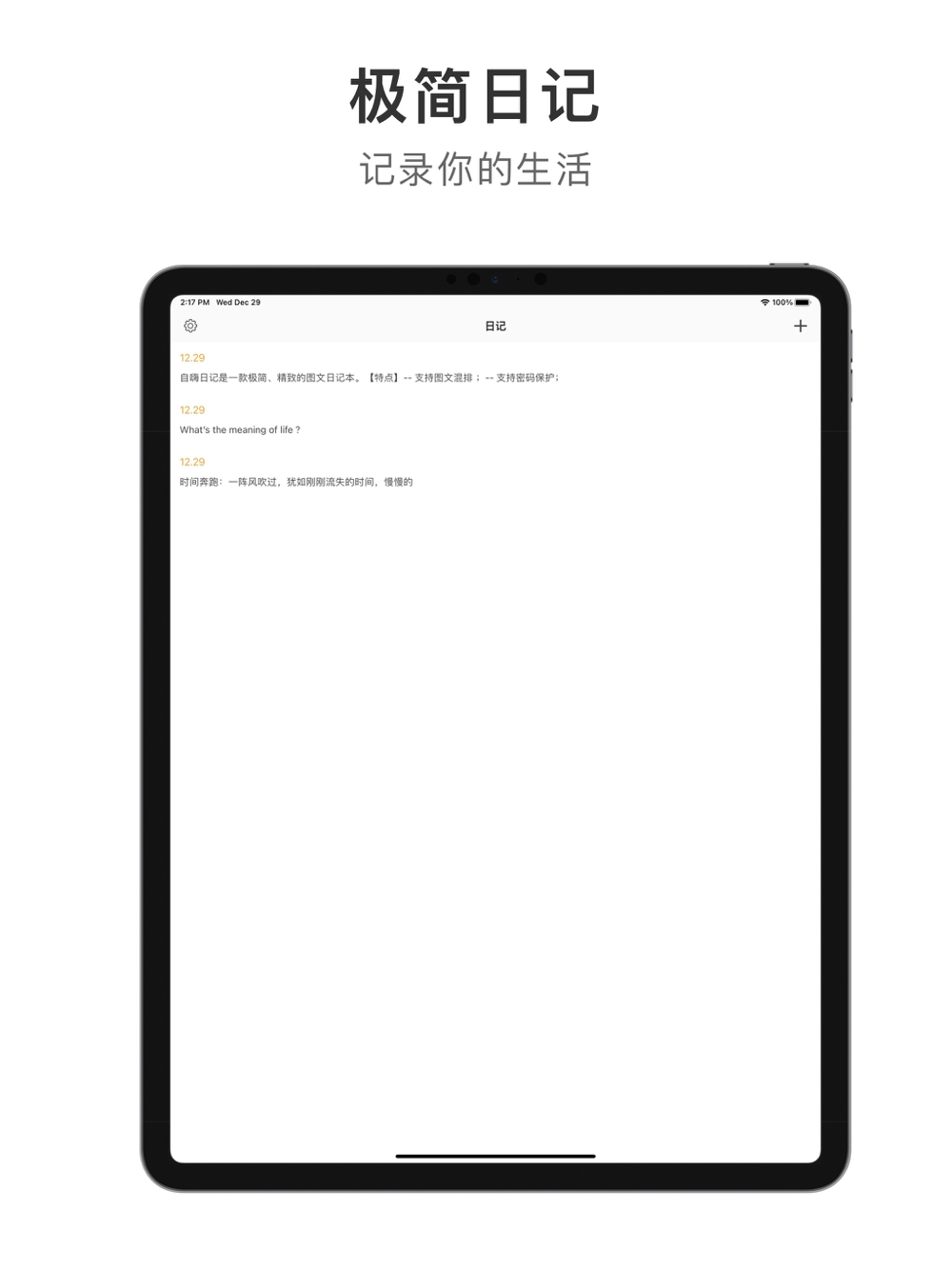 只为打造最简洁的日记应用,在这个繁杂的社会中,通过记录生活的点点滴滴,来找到自己心灵的宁静 -- by 杰克