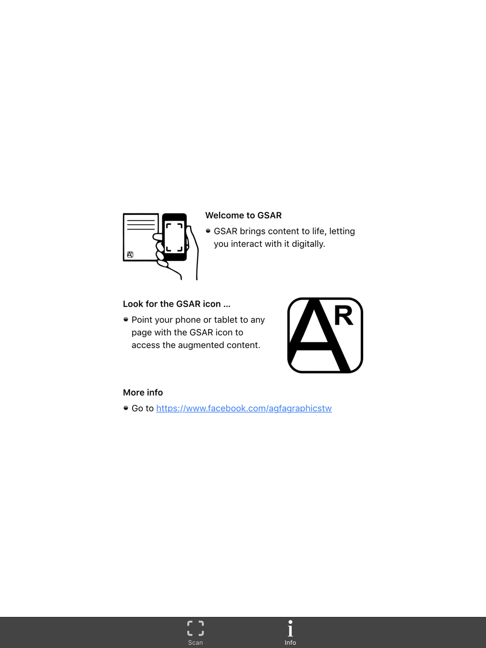 Simply launch GSAR and use the camera of your smart phone or tablet to a recognized object on the printed material. You will find additional contents become available on the device screen. You can explore the contents by clicking the content icons.