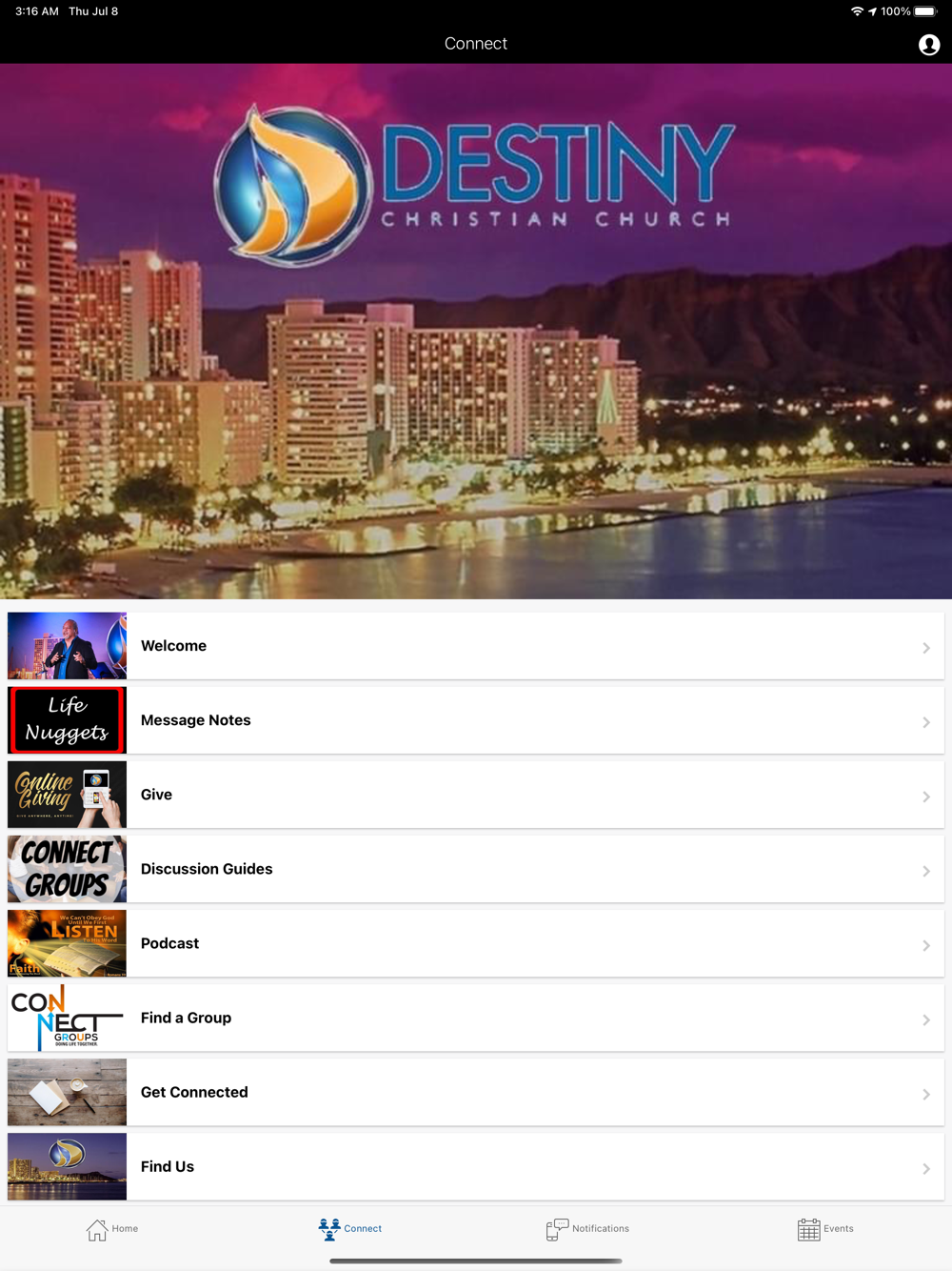 Our Destiny church app is now available for smart phones in the app store. Download it today to access audio sermons, bulletins and fillable message notes, go over Connect Group Discipleship Guides, view our social media, submit a prayer request, or share your testimony!