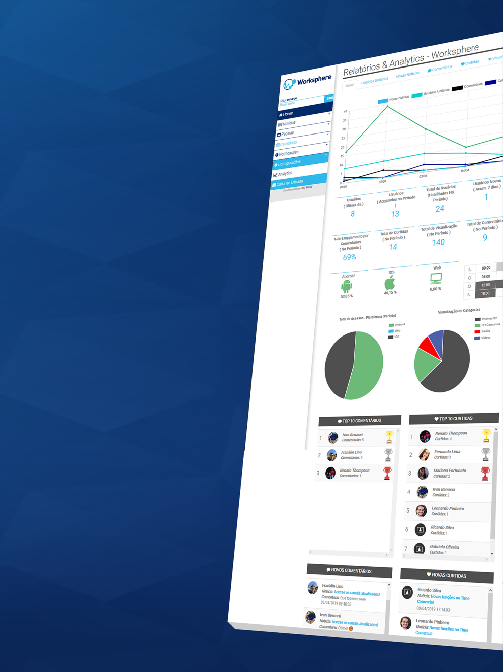 Espaço para o administrador do canal conferir os indicadores da plataforma, como visualizações, curtidas, comentários, mapa de calor com os horários mais acessados, etc. Gere relatórios e tenha em tempo real os resultados das ações!