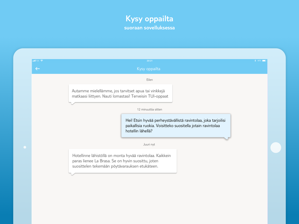 TUI-sovelluksen kautta voit olla yhteydessä oppaisiin ympäri vuorokauden, kaikkina viikon päivinä. Lähetät kysymyksesi sovelluksen Kysy oppailta -osiossa ja saat vastauksen nopeasti. Ja oppaat tavoitat sovelluksen kautta jo suunnitteluvaiheessa – matkan varaamista seuraavasta päivästä alkaen. Sovellukseen saat myös viestejä, niin hyviä lomavinkkejä kuin tietoja tärkeistä asioista matkan aikana.