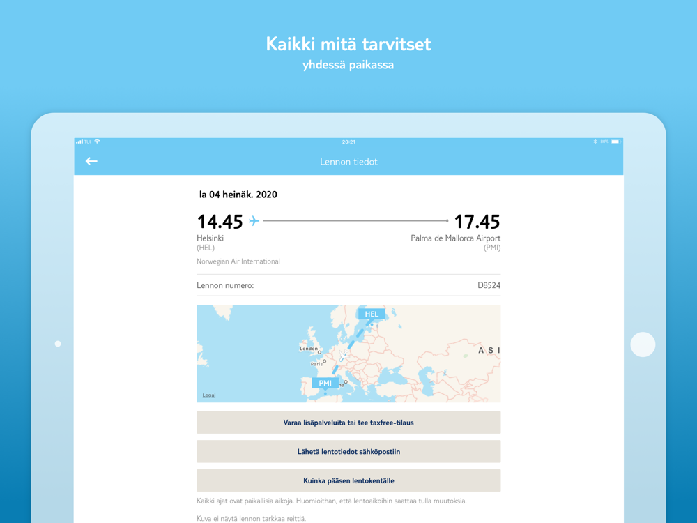 Lomasovelluksemme kautta voit tehdä tax-free-ostoksia sekä varata istumapaikan, lisää jalkatilaa tai matkatavarapainoa. (Koskee vain tiettyjä lentoja).