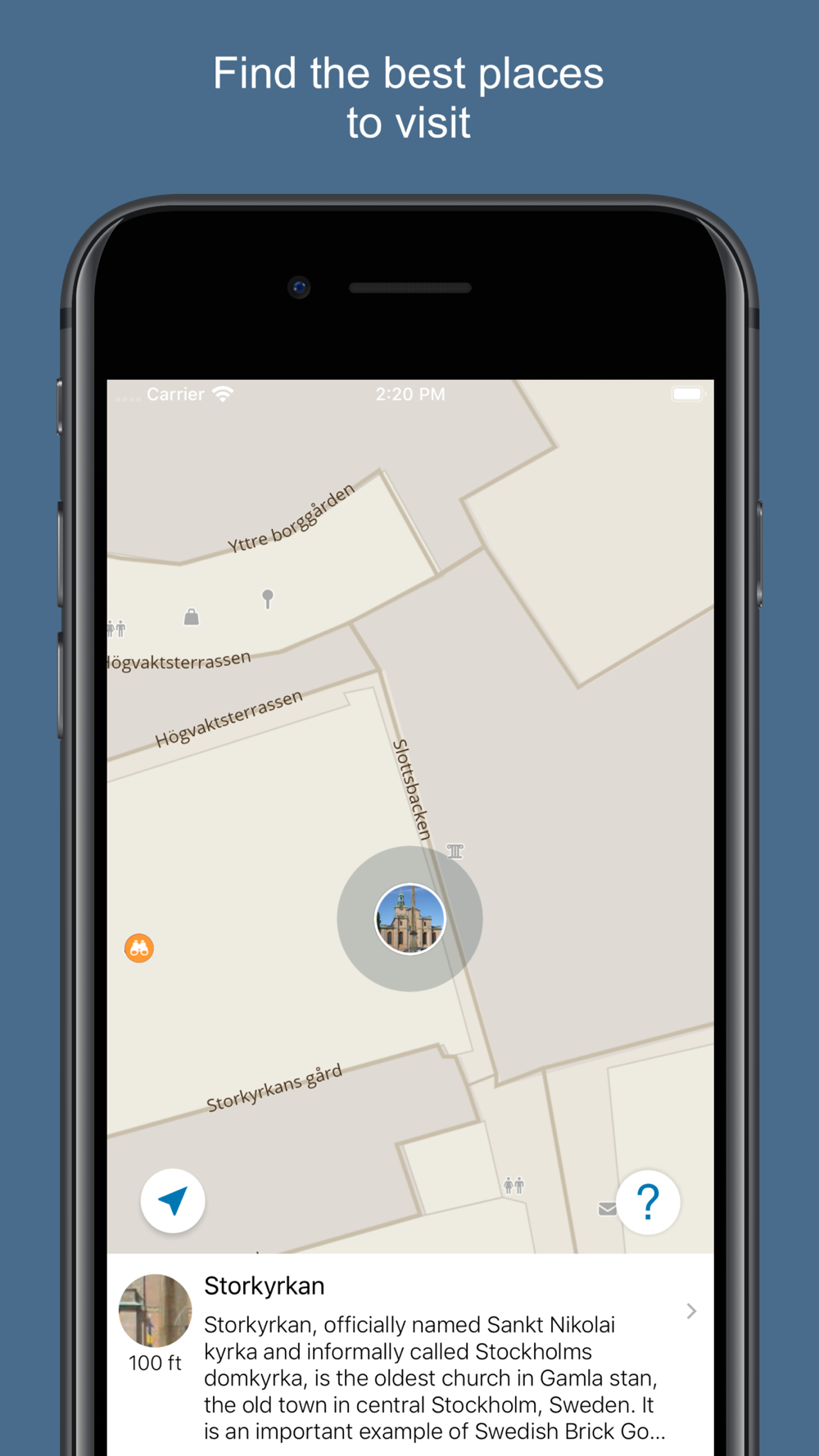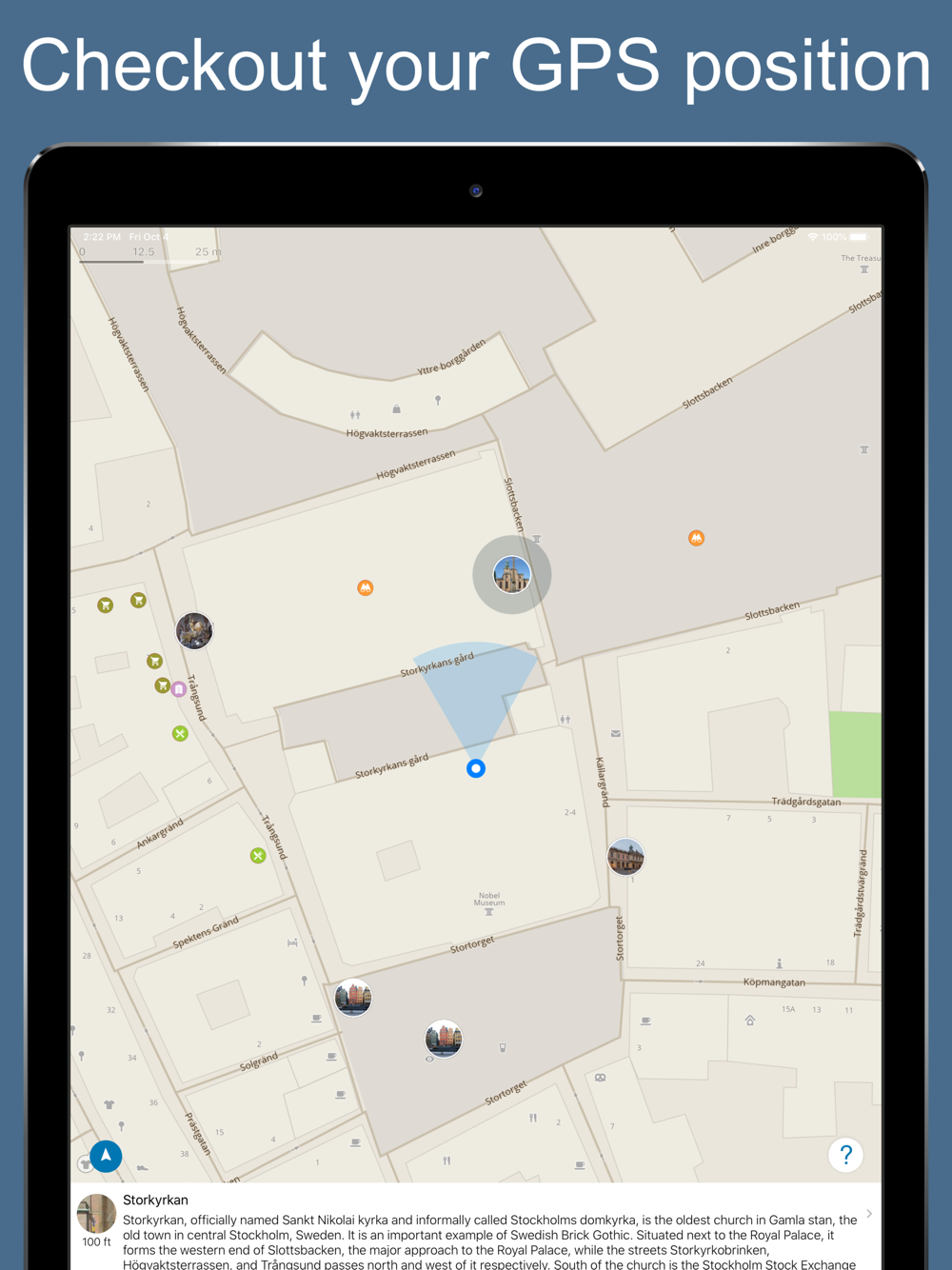 Install this app before your trip to Stockholm and you will be able to see your position at any moment, as well as any interesting places nearby.
