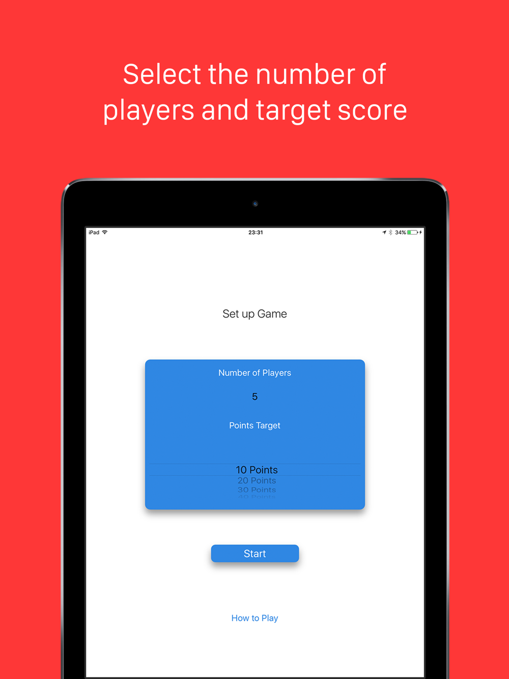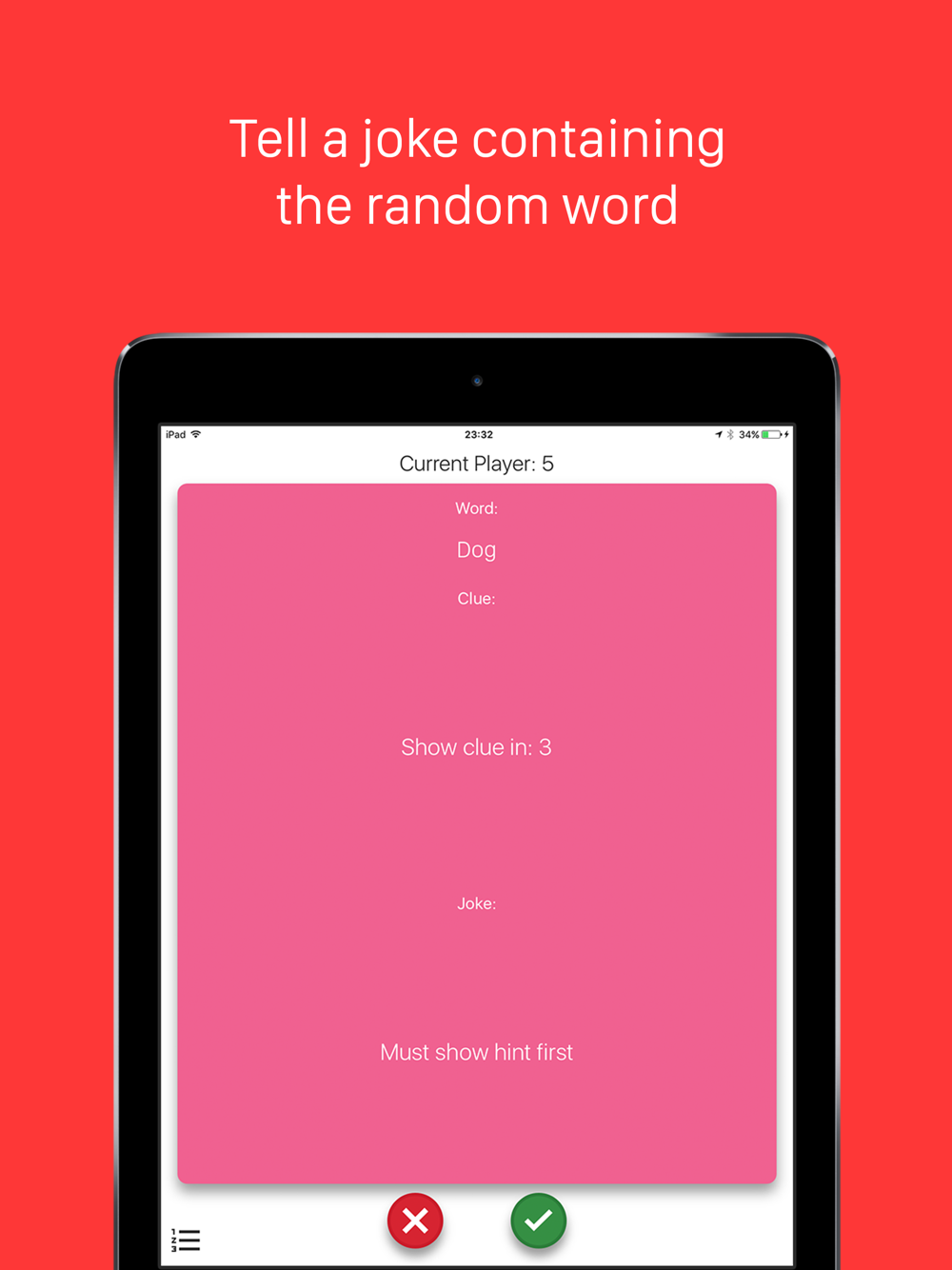 You will be awarded three points if you can think of a joke without the clue, one point if you can think of a joke with the clue but zero points if you choose to show the full joke. The app will track your scores until one of the players reaches the target score selected at the start of the game.