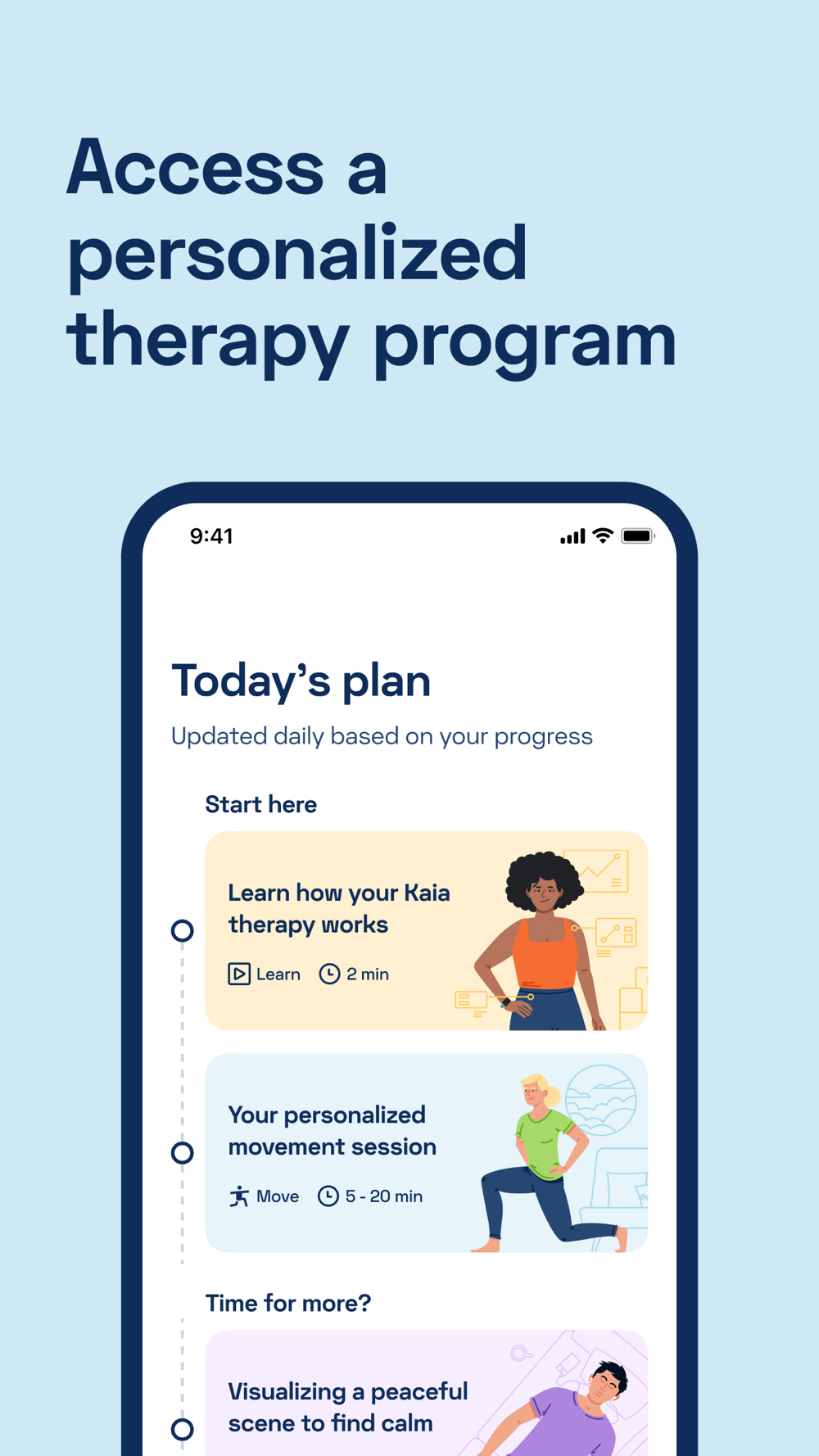 Kaia helps people manage their pain at home. Our approach offers a drug-free option with exercises for the body and mind based on guidelines recommended by the American College of Physicians.