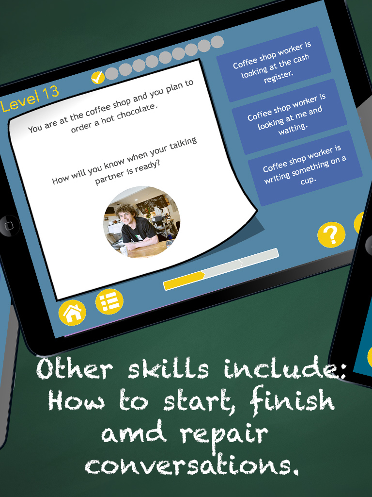 Conversation Planner teaches your child a step-by-step method to prepare for any conversation or social situation. Kids learn to think about who they are talking to, what that person will expect, when to know the person is ready for the conversation, etc. Conversation Planner gives your child the tools to complete successful conversations.