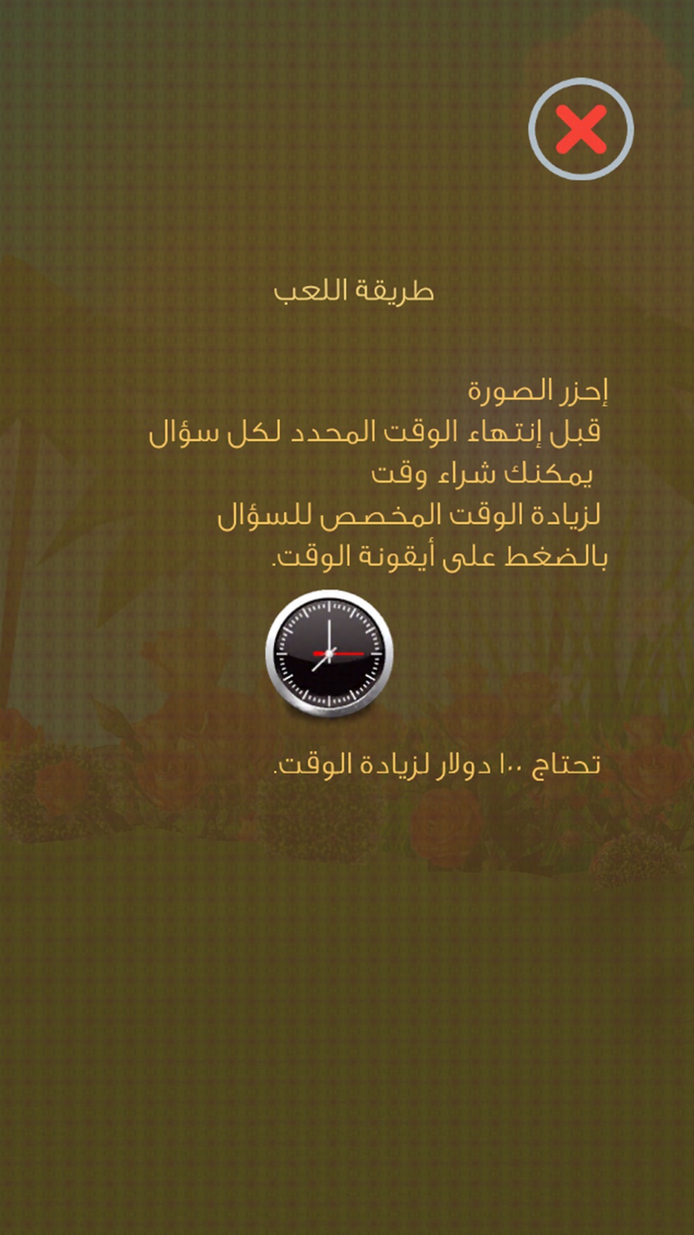 احزر الصورة قبل إنتهاء الوقت المحدد لكل لغز، يمكنك شراء وقت إضافي باستخدام ايقونة الوقت قبل انتهاء الوقت.