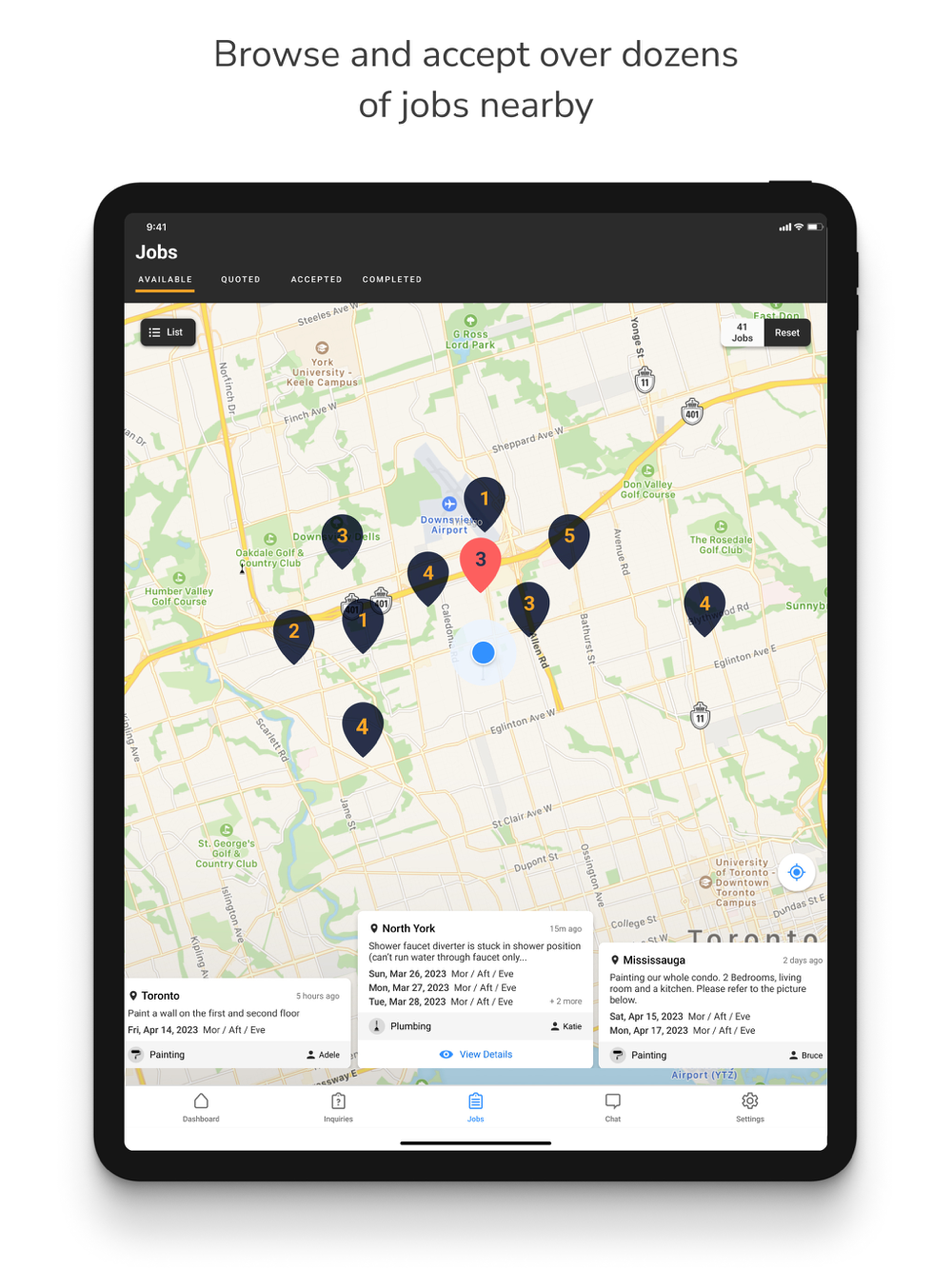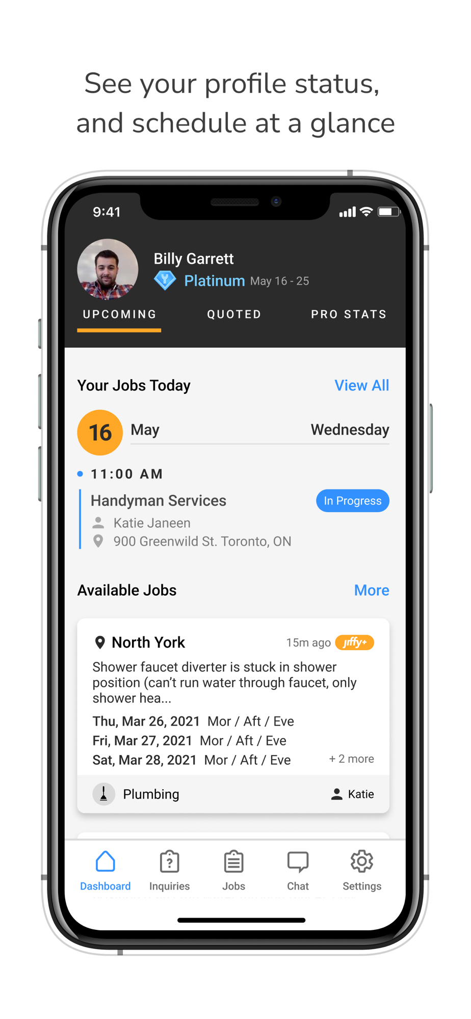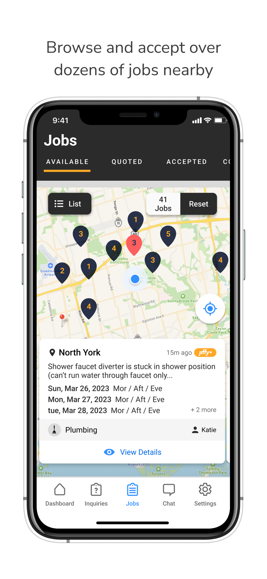 With the Jiffy Pro app, we've given professionals an easy way to accept and manage their Jiffy jobs while on the road. You can easily see which jobs are available nearby and if it's something you can fulfil, the job is yours! You can also bill out the job on the spot while all the details are still fresh in your mind, and get a receipt before you even leave the appointment.