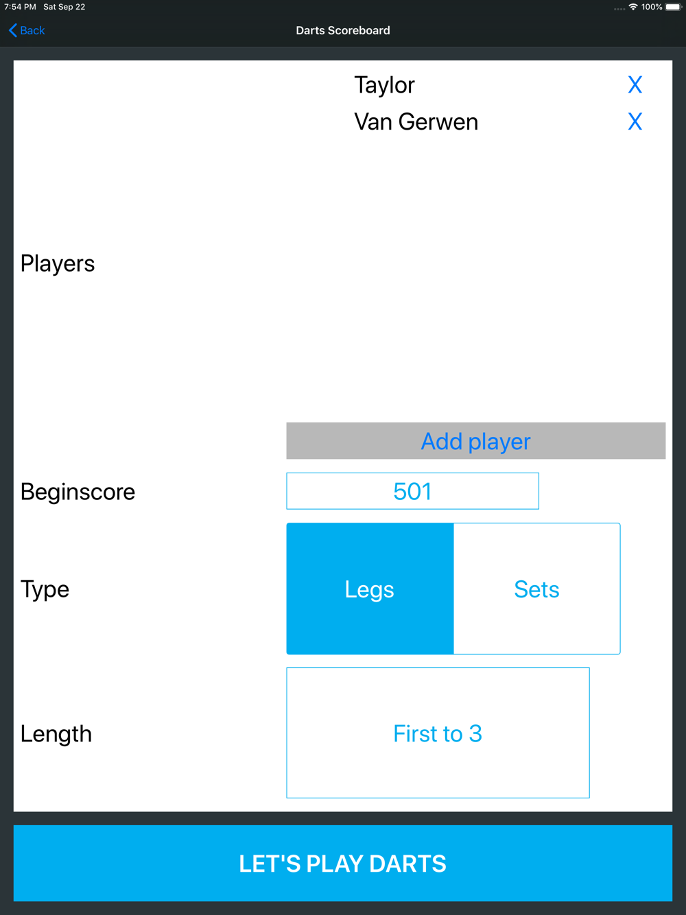 It is possible to change several preferences like the startscore (for example 101, 170, 301, 501 and a lot more) and player names. It is possible to play legs or sets.
