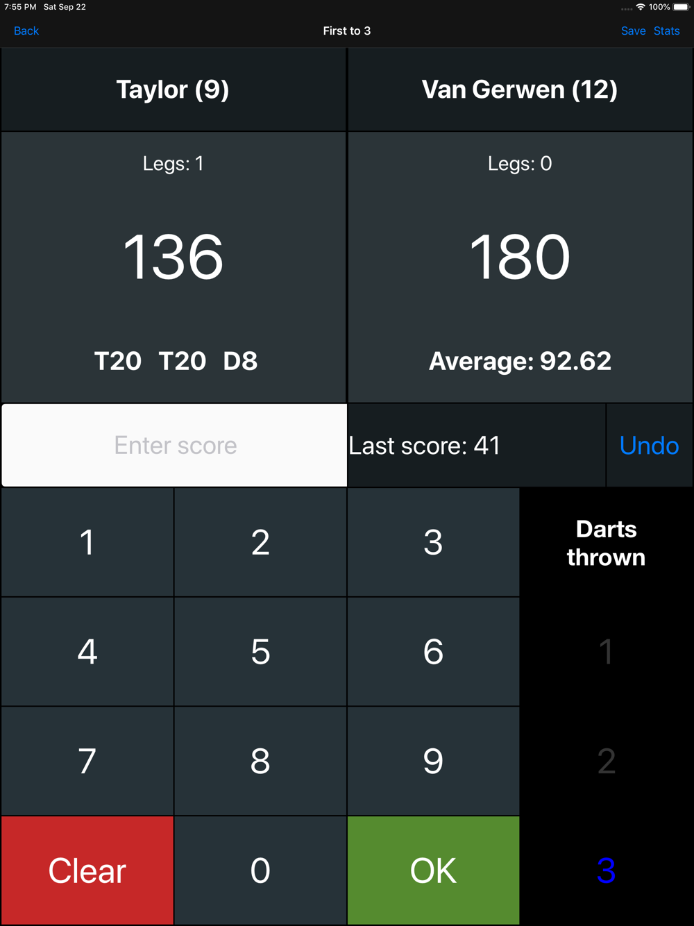 Darts Scoreboard X01 is an easy help for keeping scores during darts matches on your iPhone or iPad. The app can keep track of sets an legs and displays information like the three darts average and checkout suggestions. A lot of statistics are included like match and leg average, highest score, highest checkout and an overview of 100+, 140+ and 180's.