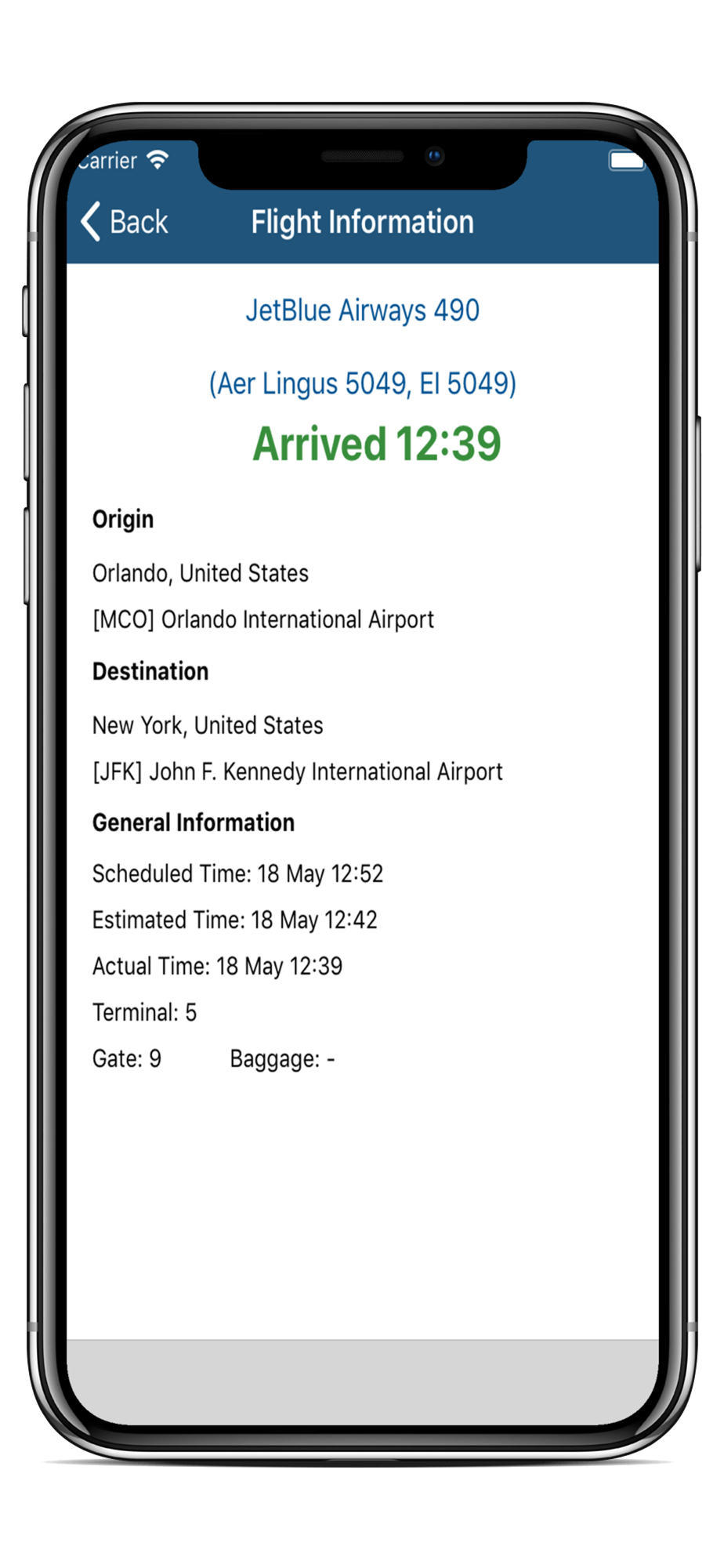 2) Detailed flight information (terminal, gate number, baggage area, flight number, flight status)