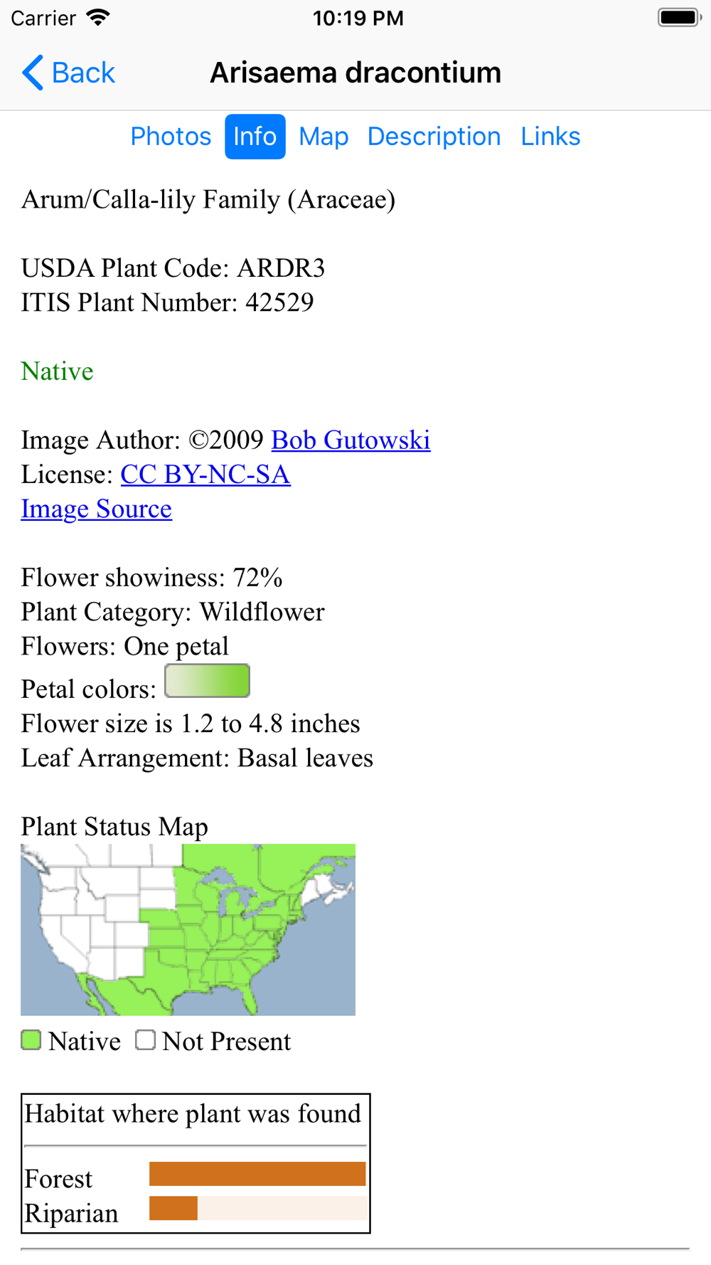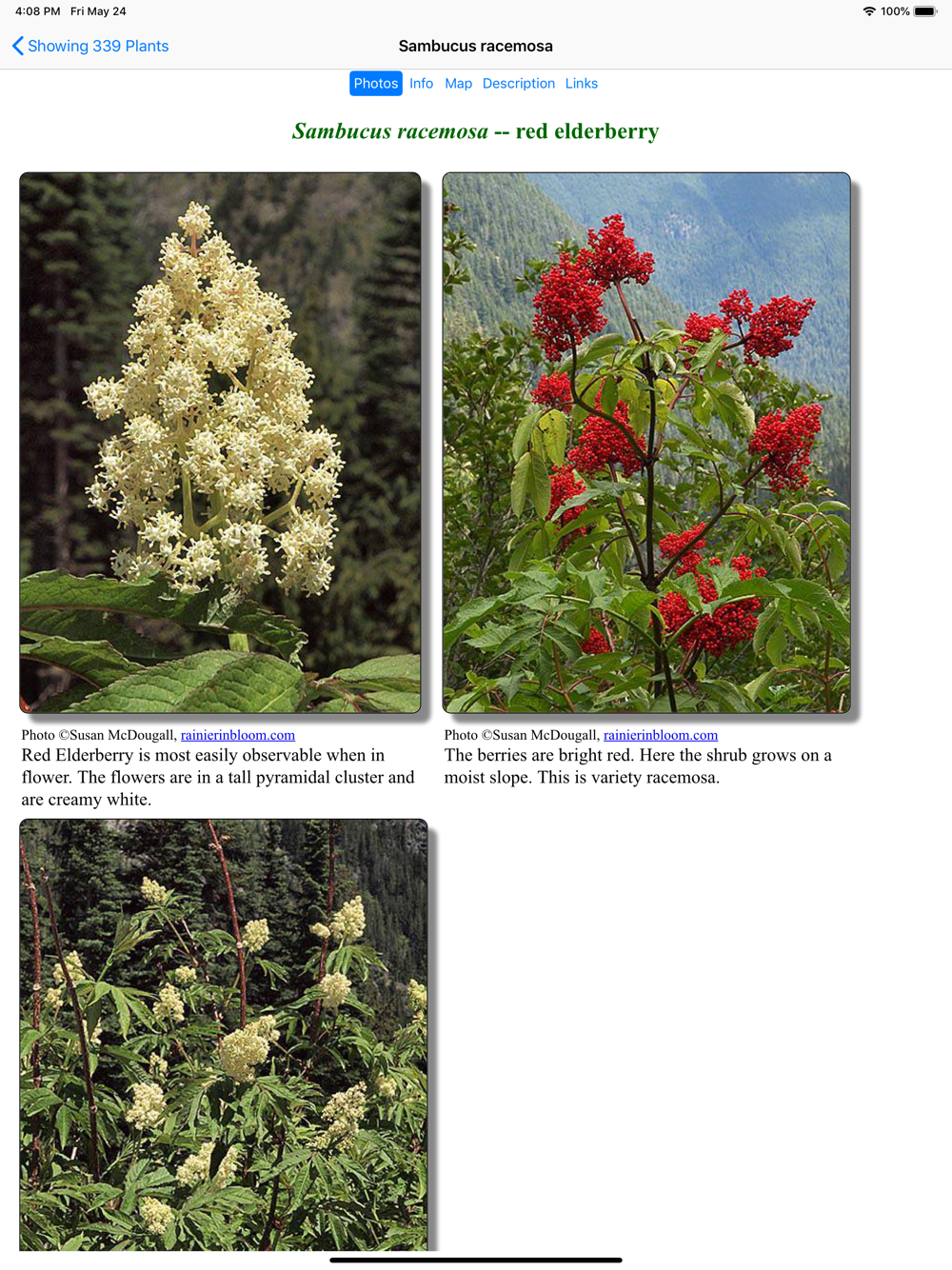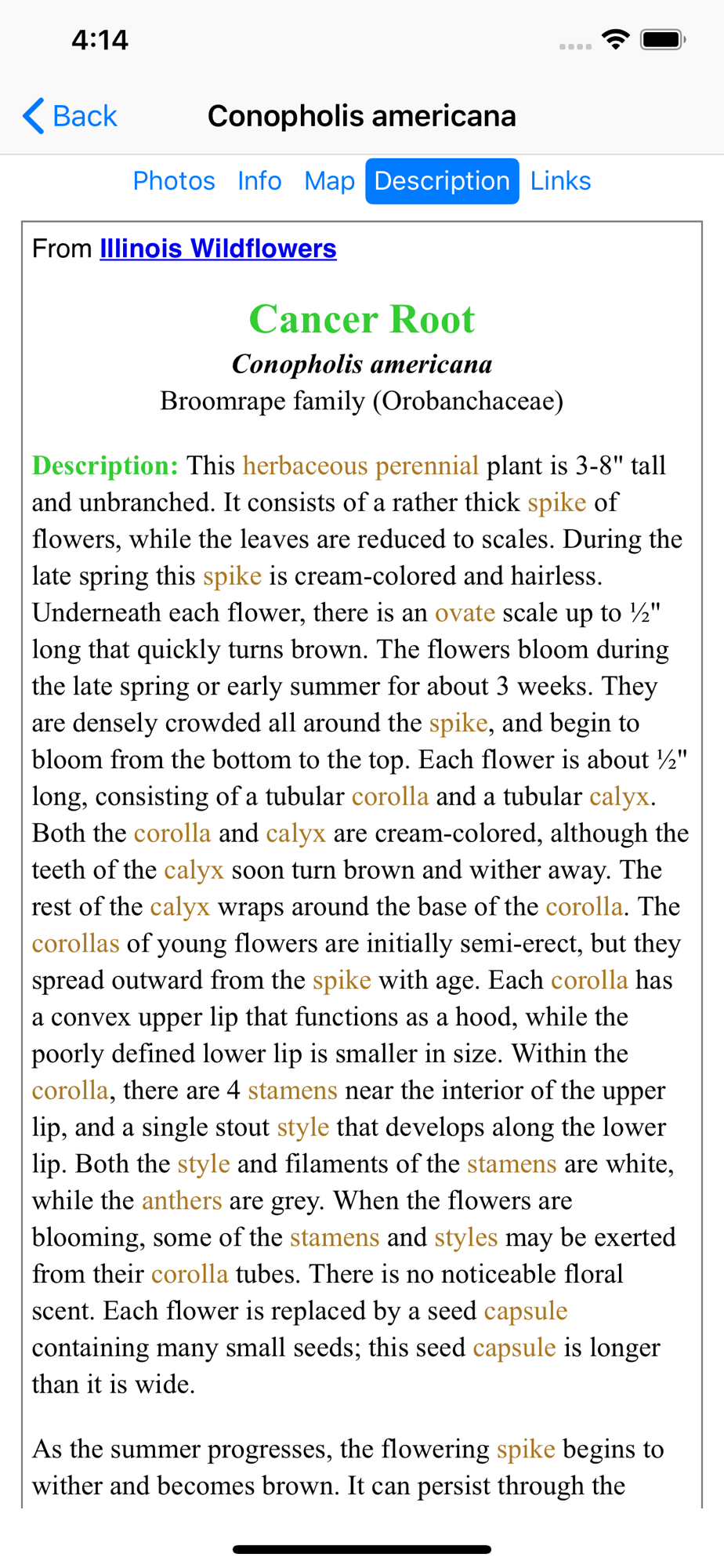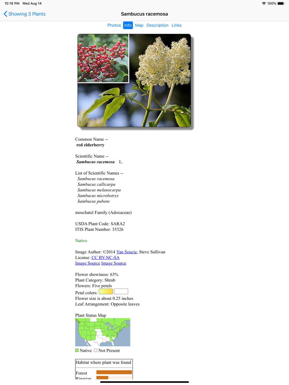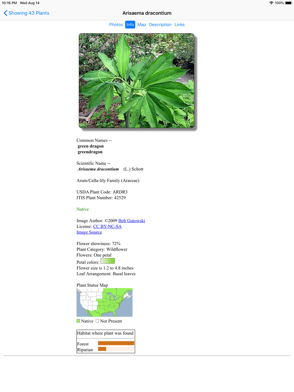 This App, which operates without an internet connection, helps find and identify plants. When you give the App information about a plant, such as its location, flower color and the time of year, the App will quickly show you which plants match your selections.