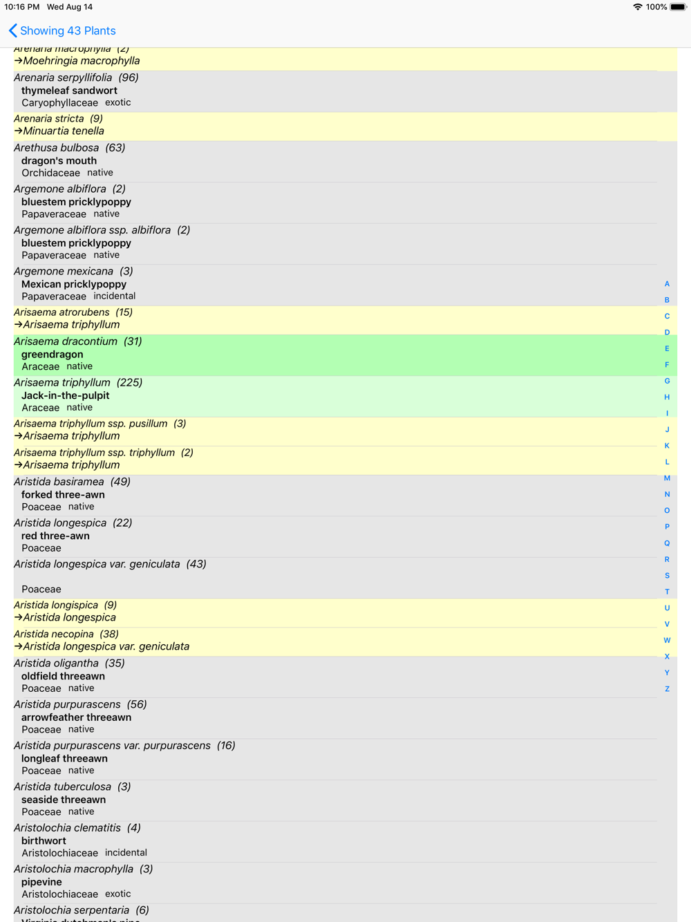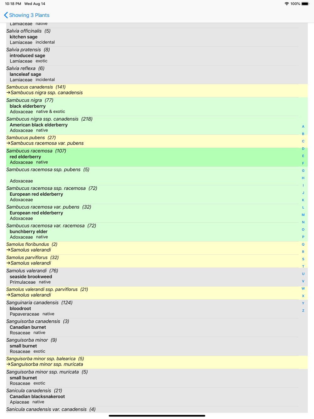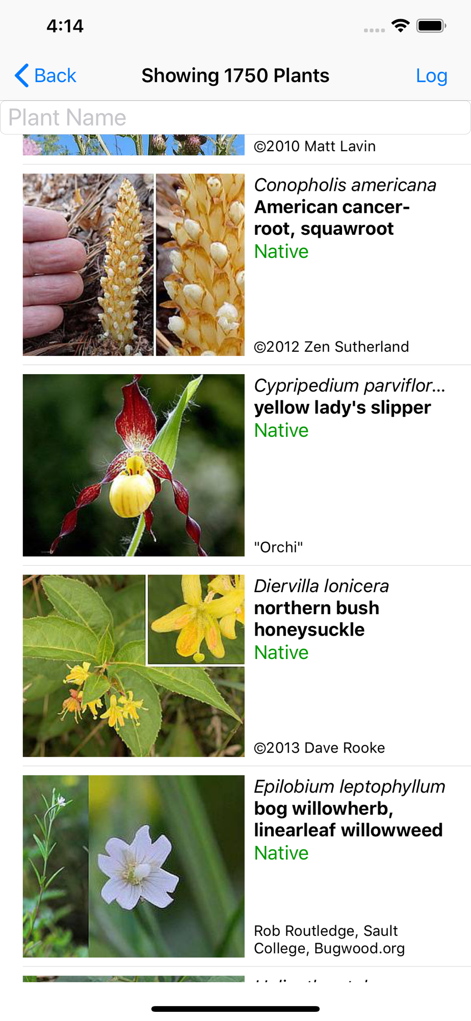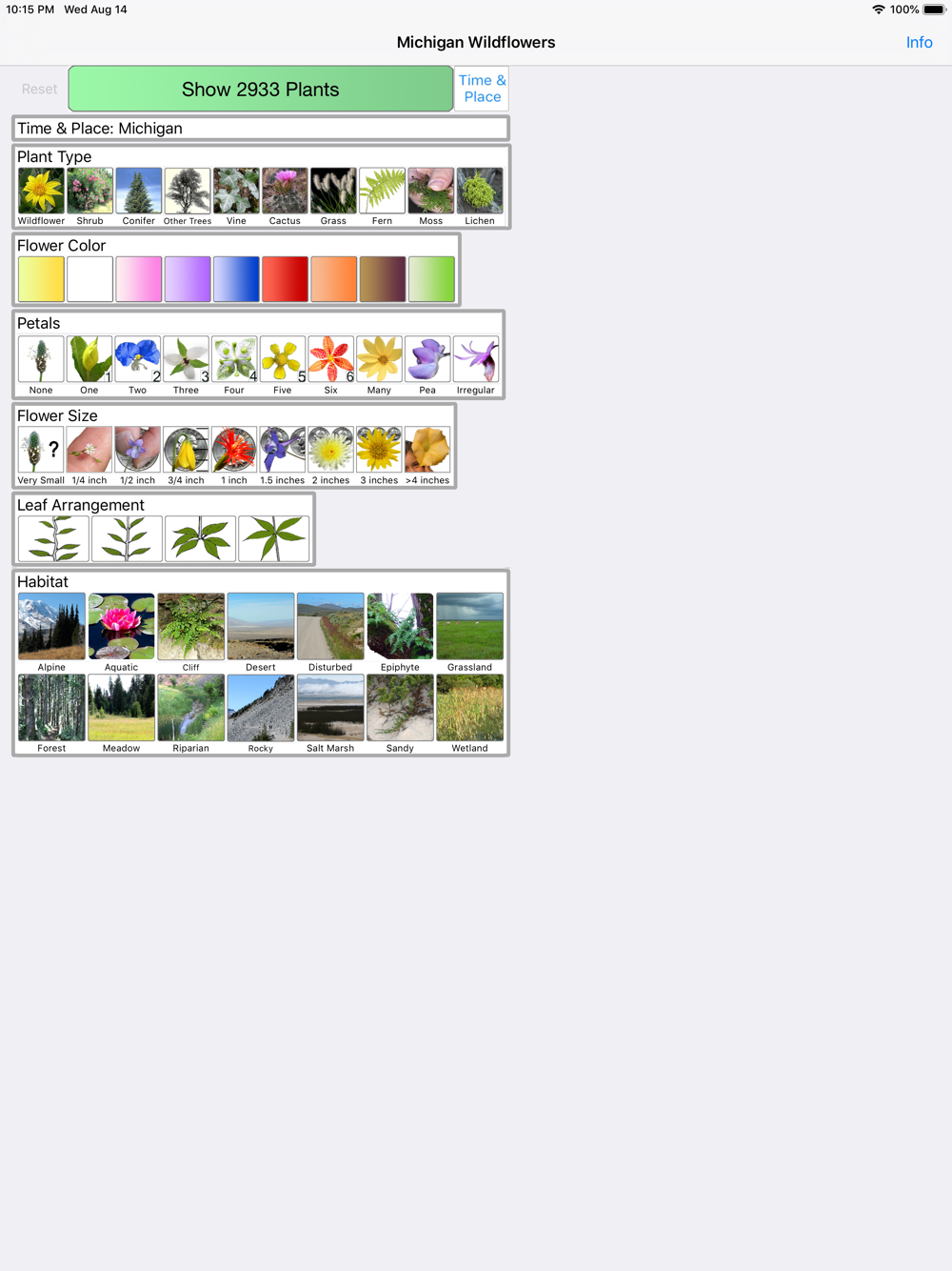 The App includes 3,190 species of plants found in Michigan. Overall, 1,482 are "Wildflowers", 246 are shrubs, 184 are broadleaf trees, 28 are conifers, 48 are vines, 512 are grass-like, 96 are fern-like, 348 are moss-like, and 344 are lichen.