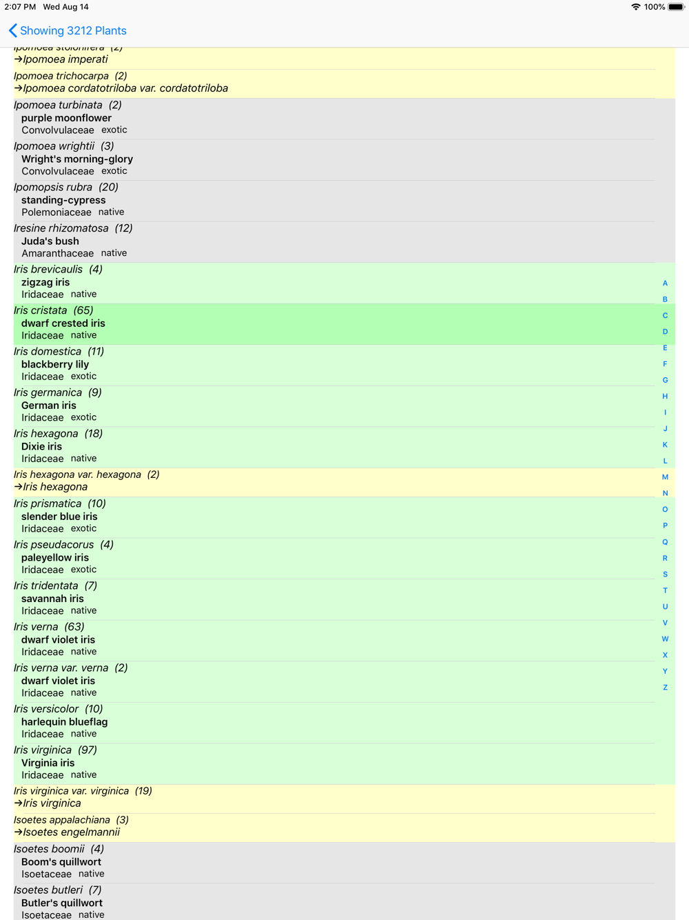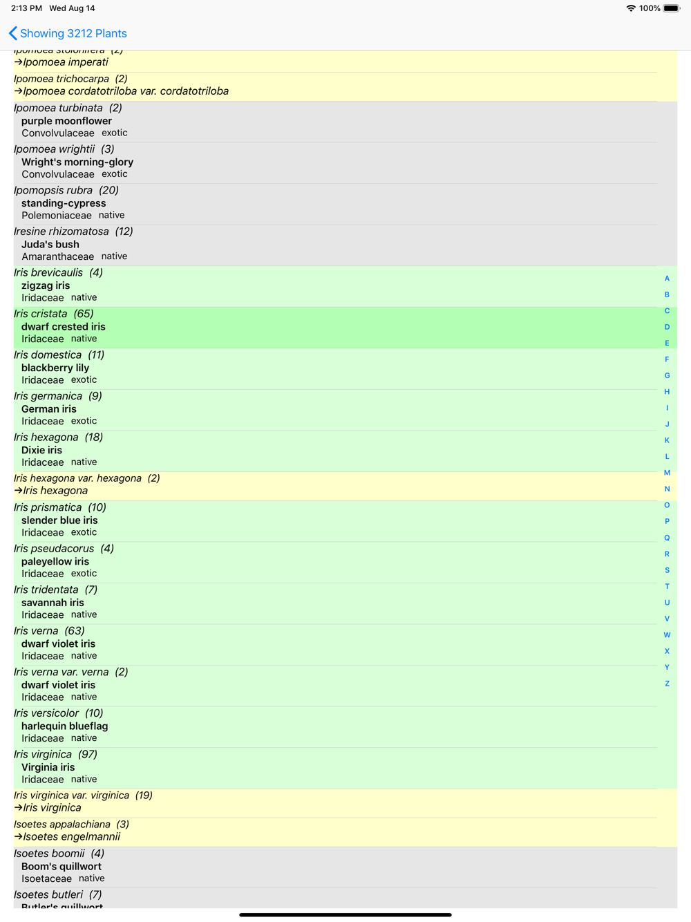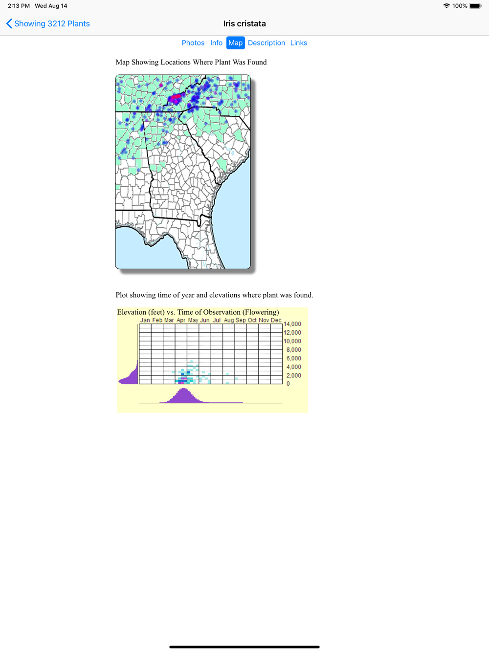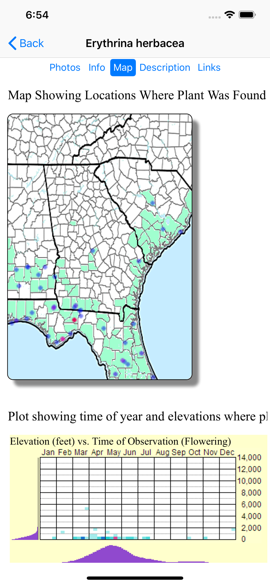 The App includes 3,571 species of plants found in Georgia. Overall, 1,877 are "Wildflowers", 346 are shrubs, 260 are broadleaf trees, 27 are conifers, 118 are vines, 5 are cactus, 591 are grass-like, 92 are fern-like, 218 are moss-like, and 229 are lichen.