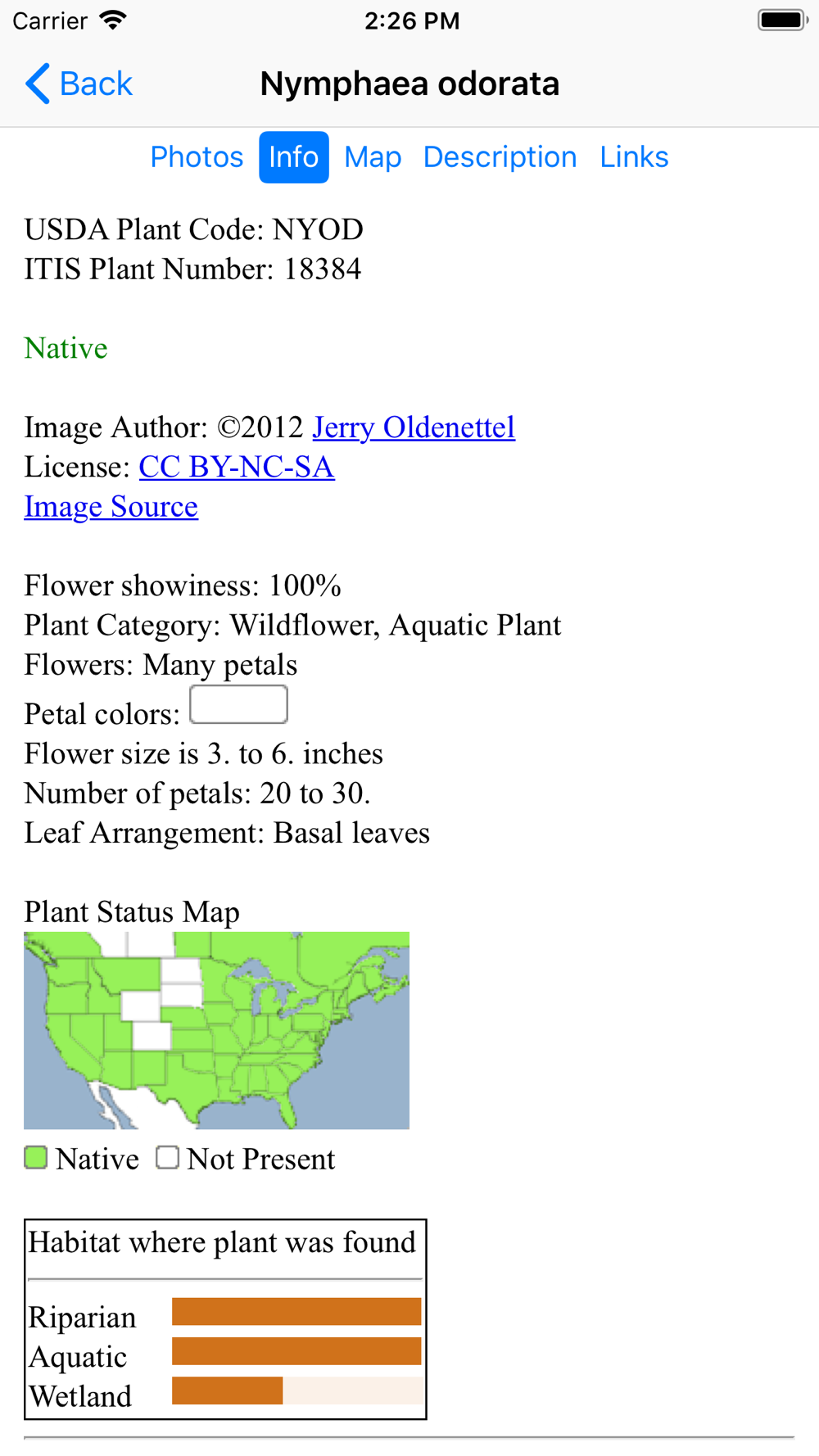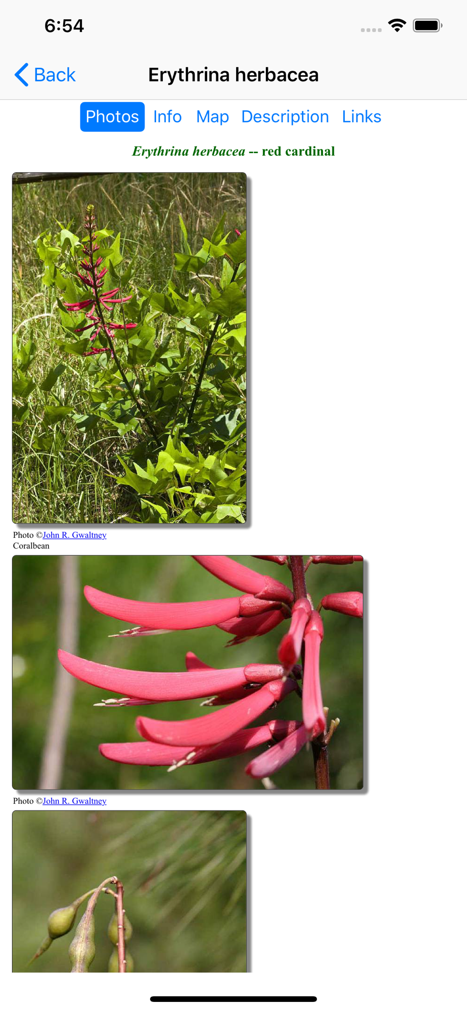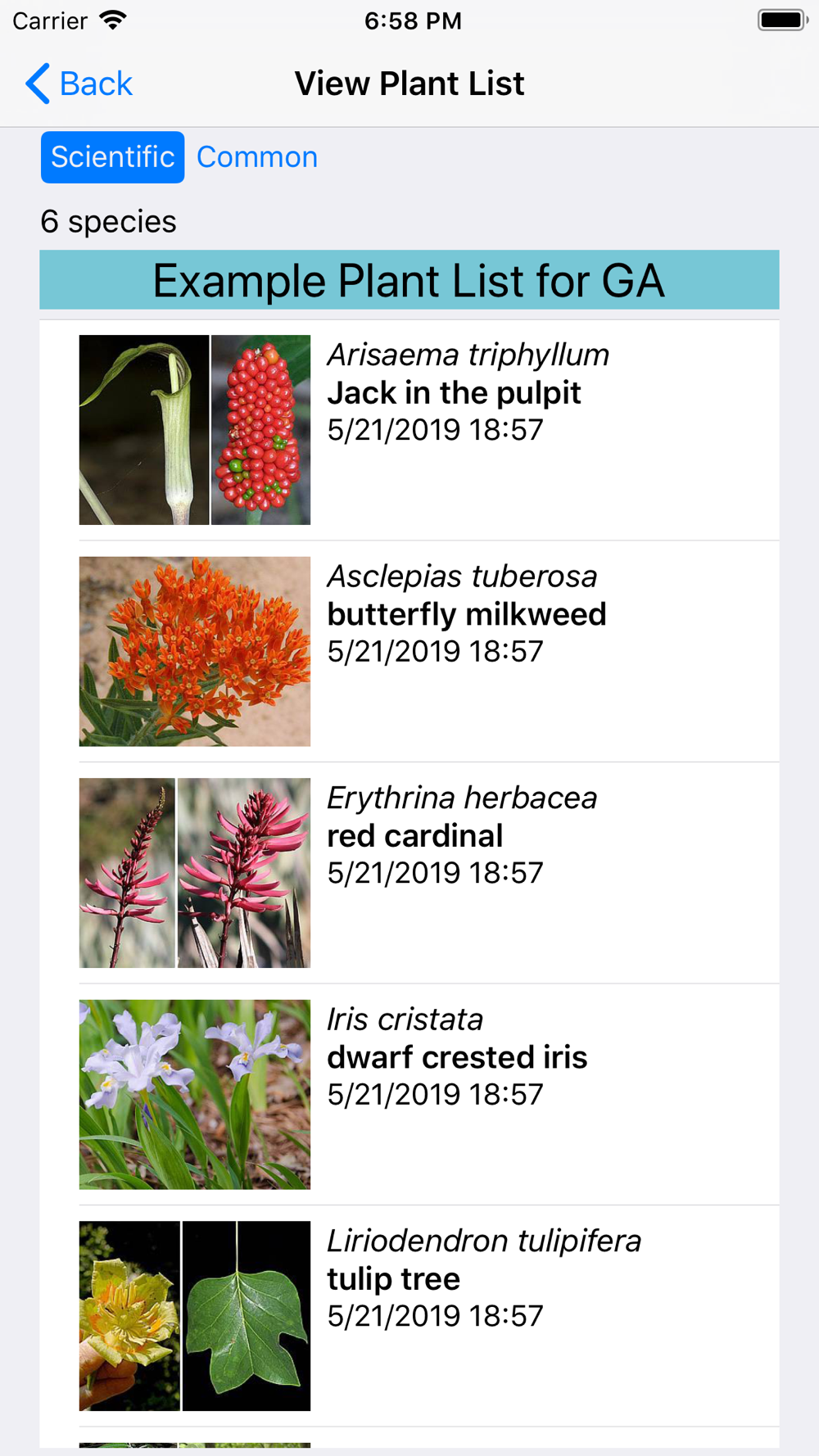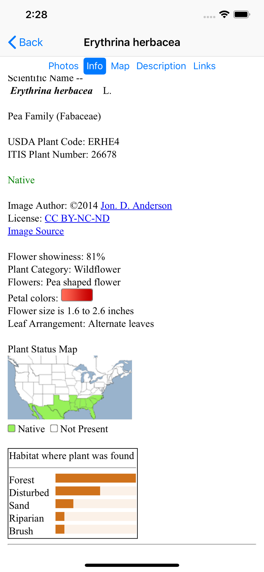 The App includes 3,571 species of plants found in Georgia. Overall, 1,877 are "Wildflowers", 346 are shrubs, 260 are broadleaf trees, 27 are conifers, 118 are vines, 5 are cactus, 591 are grass-like, 92 are fern-like, 218 are moss-like, and 229 are lichen.