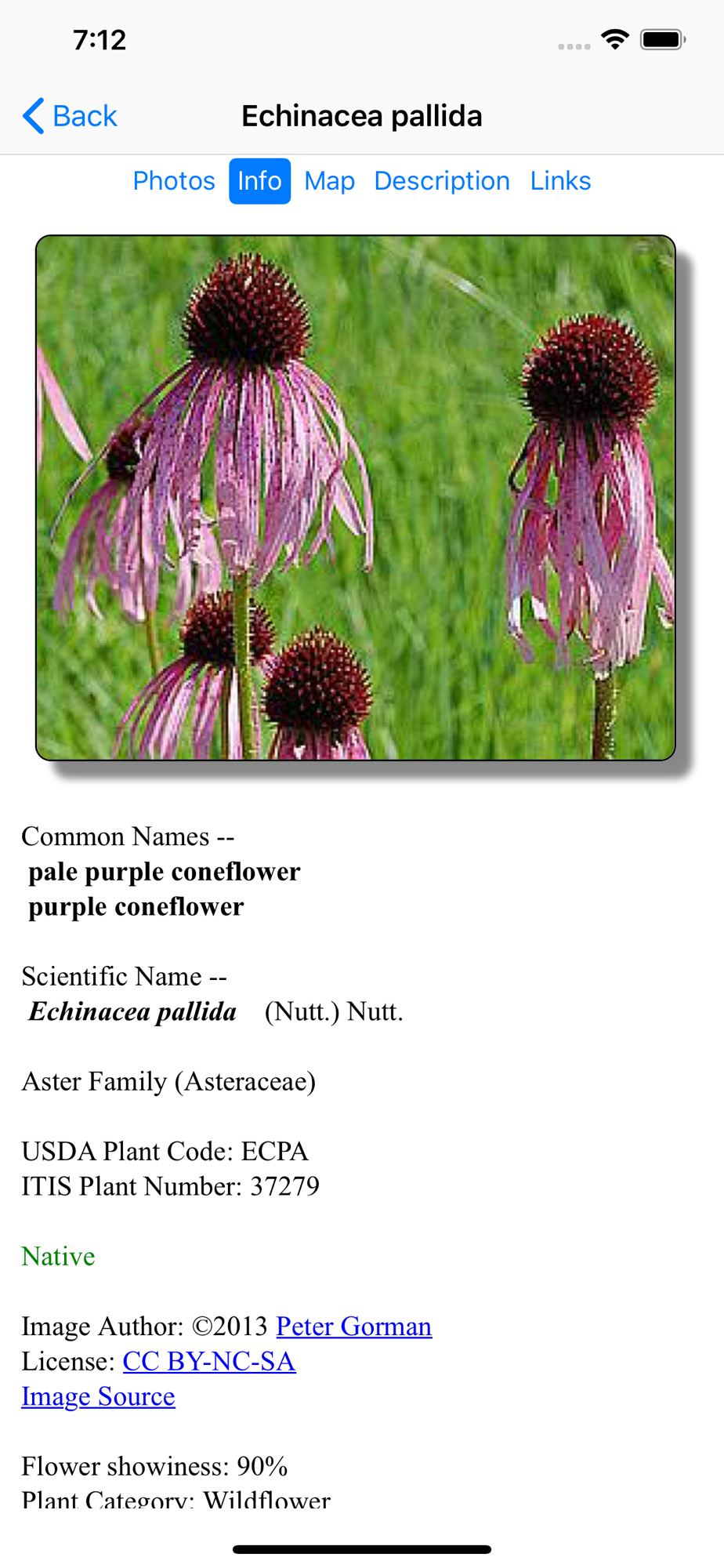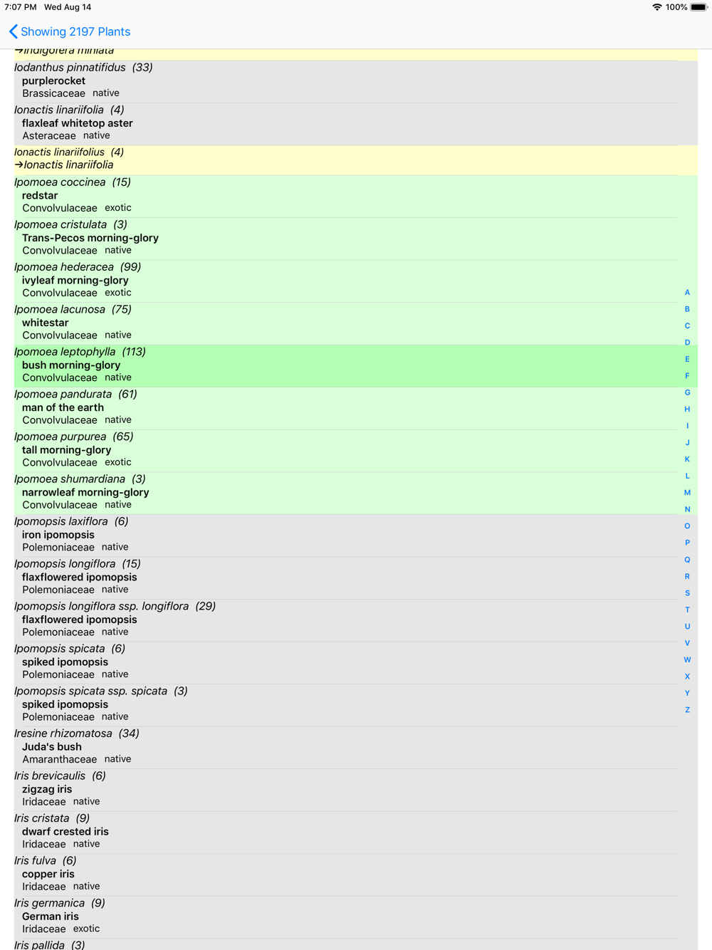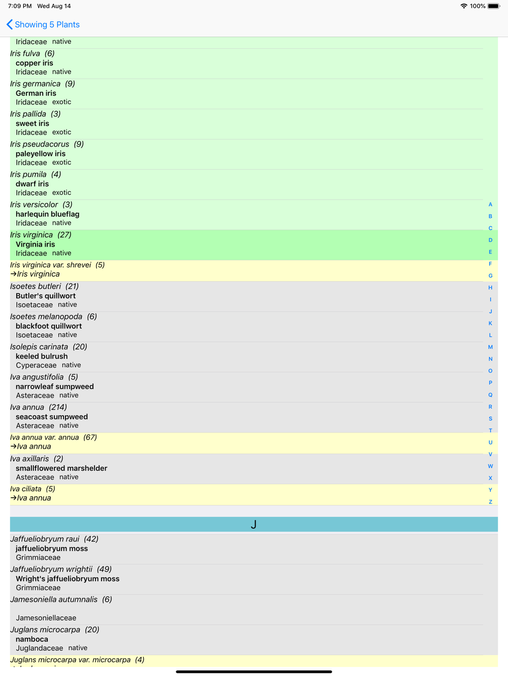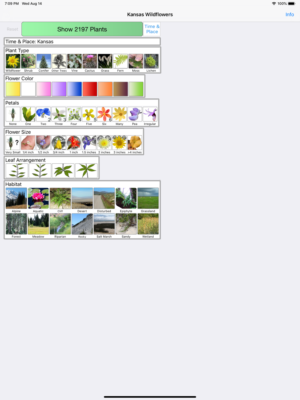 The App includes 2,428 species of plants found in Kansas. Overall, 1,383 are "Wildflowers", 161 are shrubs, 144 are broadleaf trees, 10 are conifers, 66 are vines, 10 are cactus, 411 are grasses and sedges, 37 are ferns, 160 are lichen and 137 are moss.