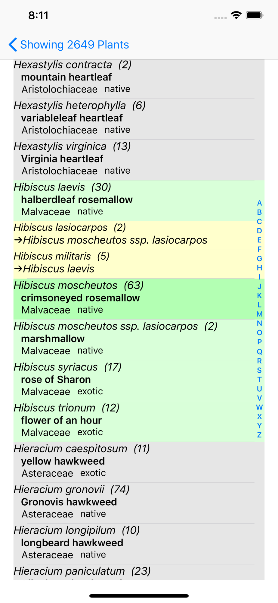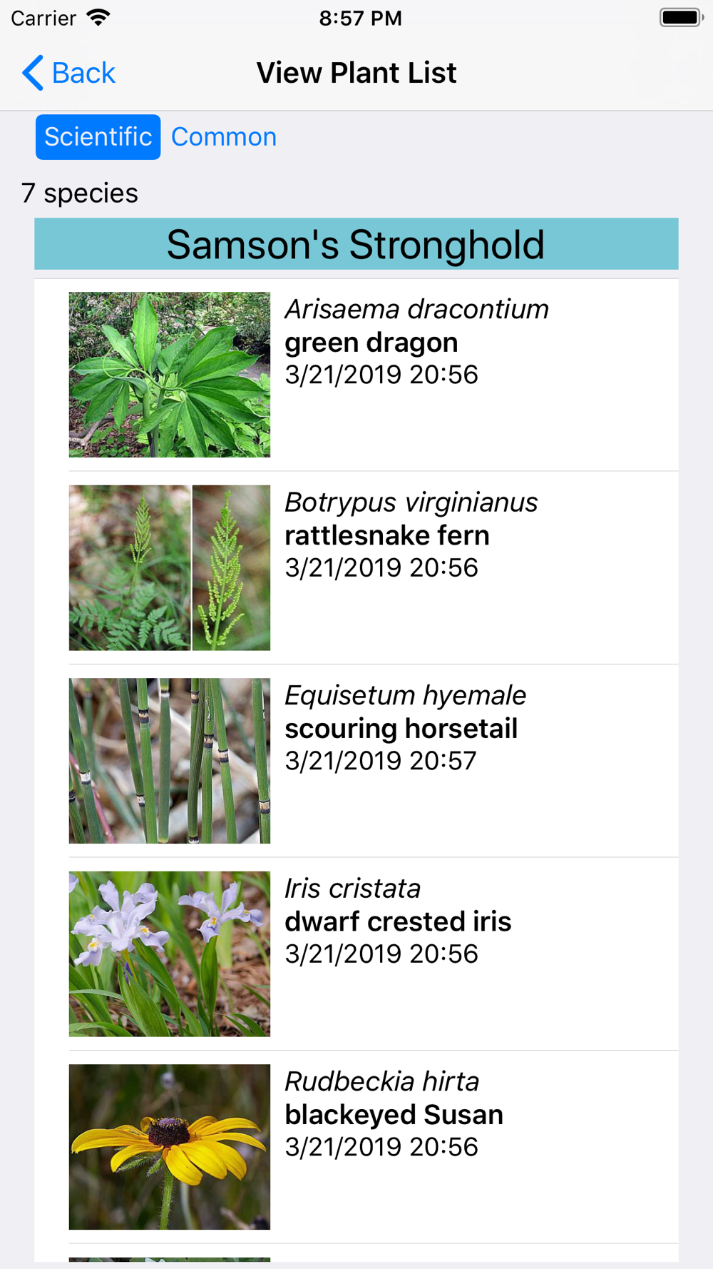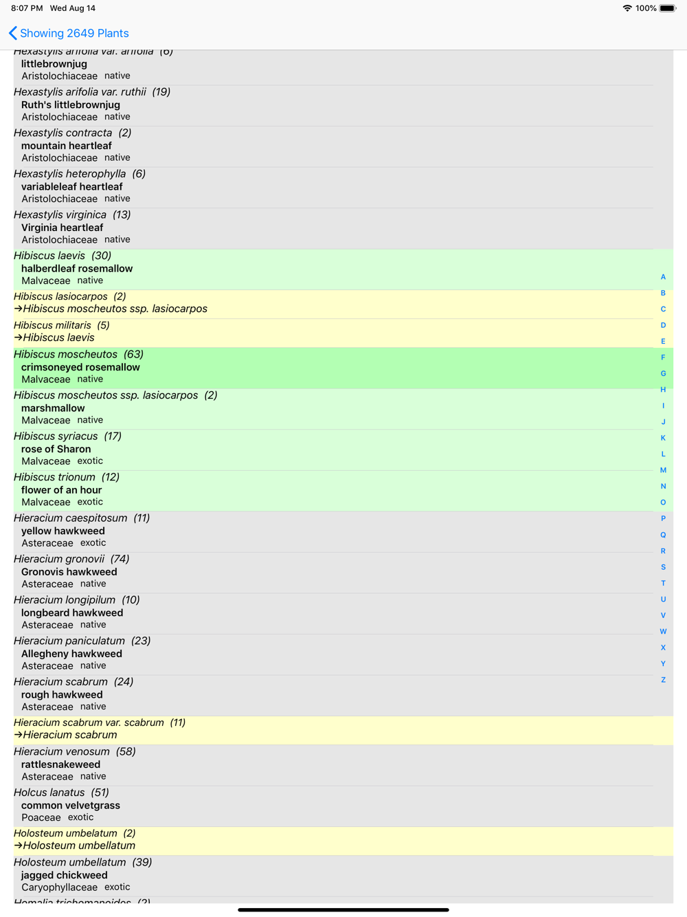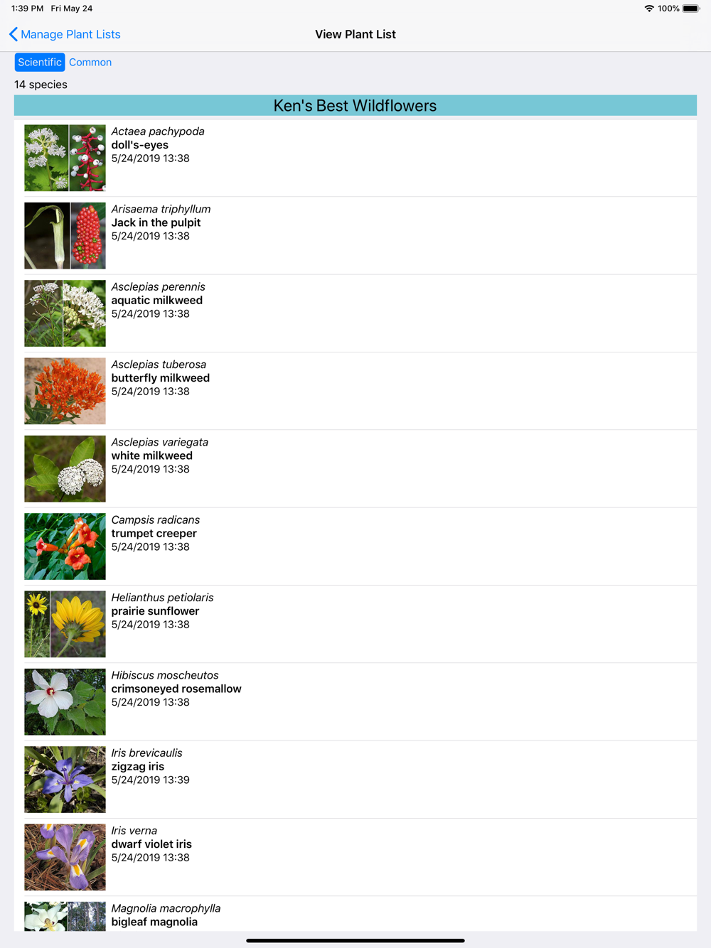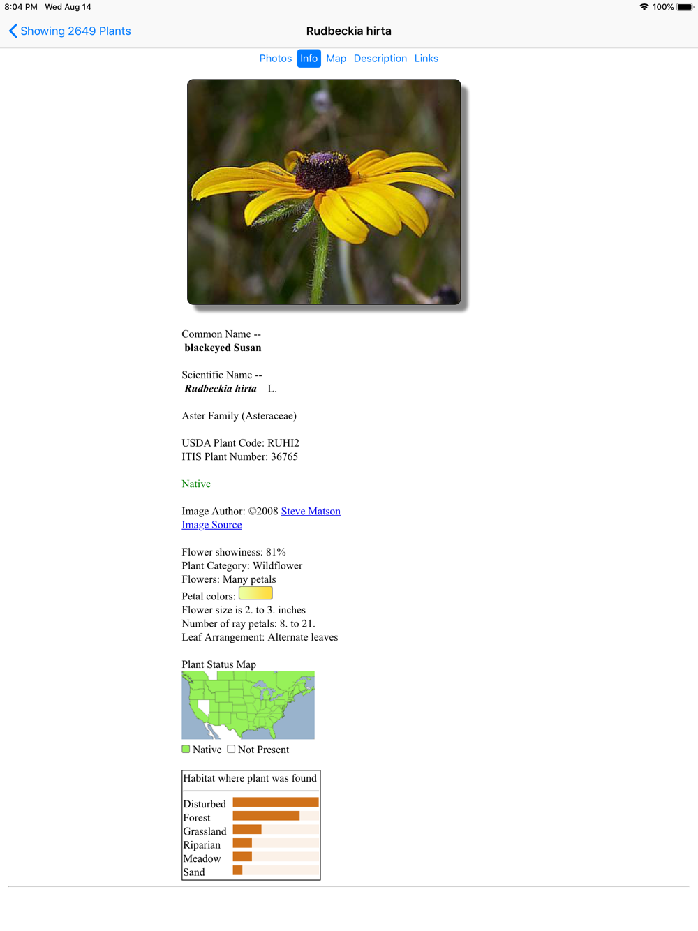 The App includes 2,845 species of plants found in Kentucky. Overall, 1,431 are "Wildflowers", 232 are shrubs, 213 are broadleaf trees, 22 are conifers, 82 are vines, 457 are grass-like, 78 are fern-like, 265 are moss-like and 185 are lichen.