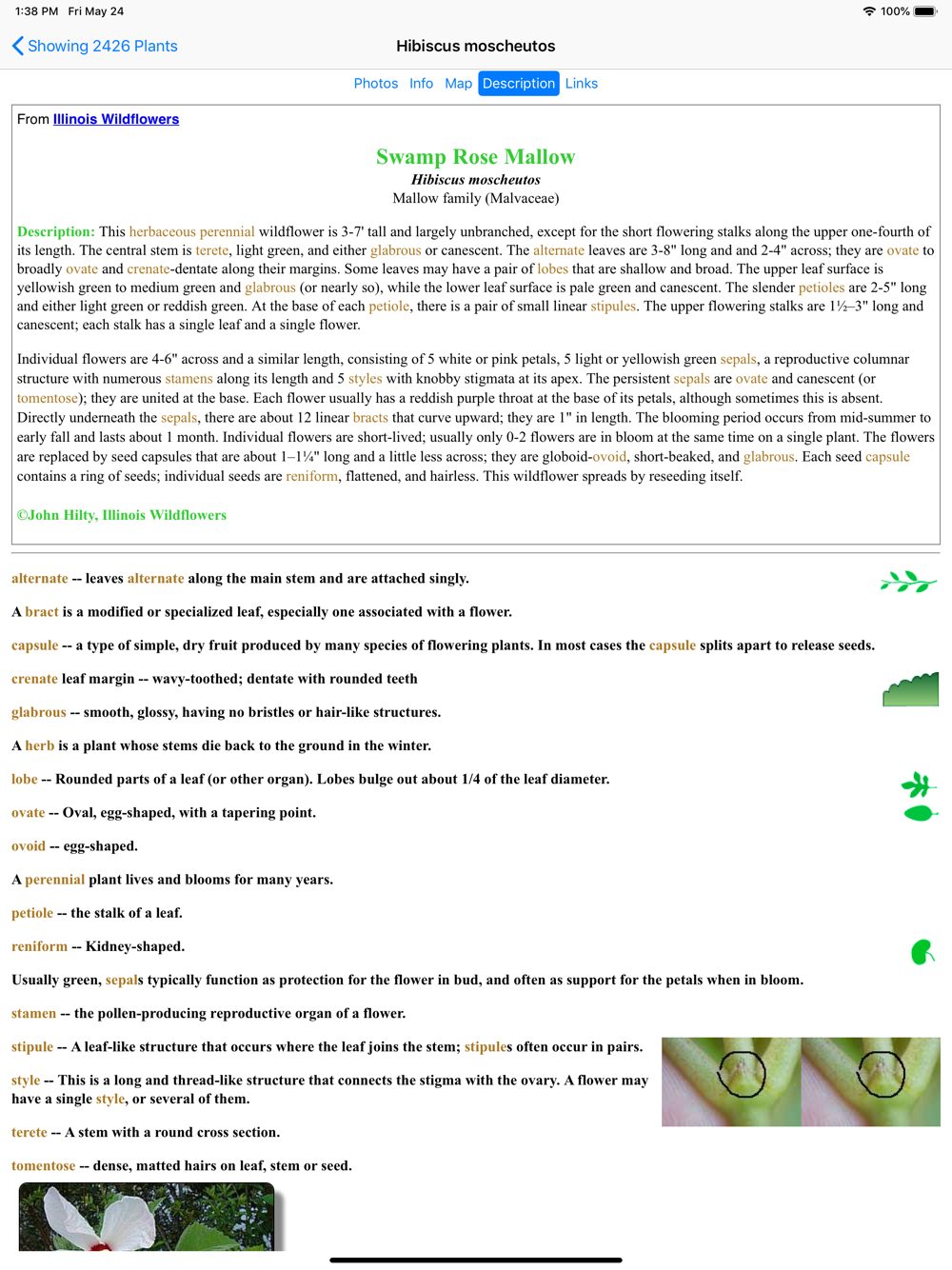 This App, which operates without an internet connection, helps find and identify plants. When you give the App information about a plant, such as its location, flower color and the time of year, the App will quickly show you which plants match your selections.