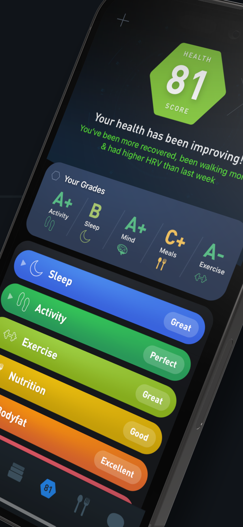 Your Health Score tells you what all the data means, with detailed grades, insights. Once you get the score, try new habits from the Labs to find correlations and make improvements.