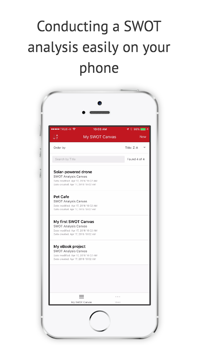 Thiss app lets your create and conduct SWOT analysis effectively on your device. You can also view and export your canvas as PDF .