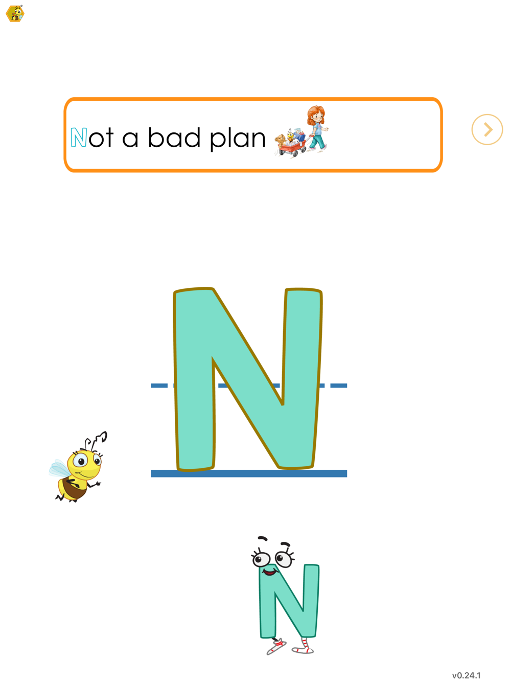 Reader Bee Big Letters is a kindergarten and first grade app that guides children in forming capital letters, and learning one use for the big letters—starting a sentence. Each word in the sentence uses only one sound per letter, and all words are short so young children can read the sentence. The magic comes when children swap out one of three picture words to make a new silly sentence by dropping the picture into the sentence. Then children can color a silly illustration for the sentence and print it. This app takes children far beyond the formation of capital letters to one of the main uses of capitals, to reading simple words, to thinking about amusing variations (making new brain connections) to making the new sentence their own. Weaving silliness into the activity is key in encouraging children to enjoy mastering early literacy skills. There are 5 sets of letters, each using Reader Bee’s daisy sets of 7-8 letters. A sequel to Reader Bee and the Story Tree, winner of many national awards, including the Parents’ Choice Gold Award, Big Letters is another classic.