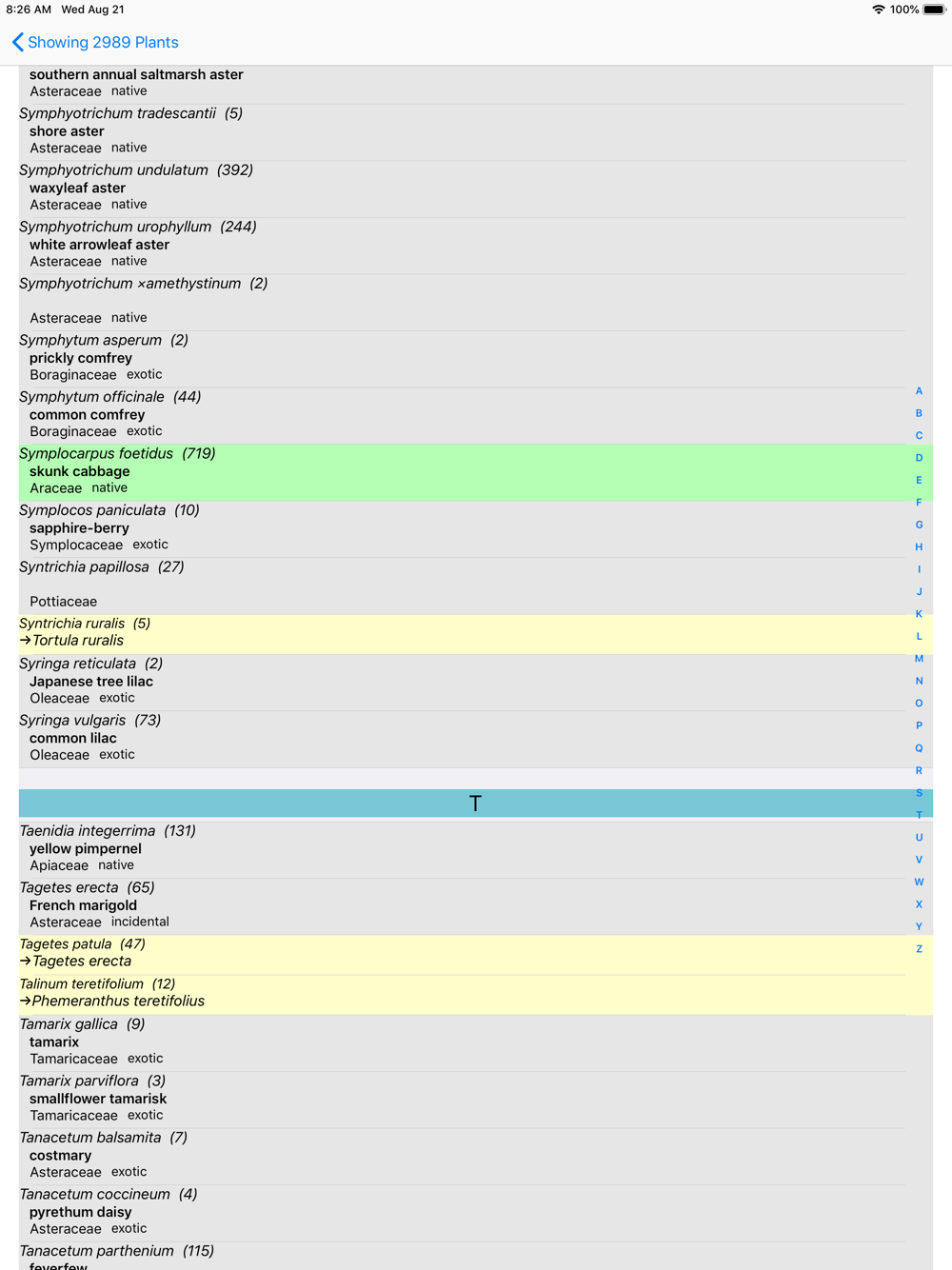 The App includes 3,176 species of plants found in Pennsylvania. Overall, 1,577 are "Wildflowers", 290 are shrubs, 221 are broadleaf trees, 35 are conifers, 70 are vines, 491 are grasses and sedges, 92 are ferns, 211 are lichen and 312 are moss.