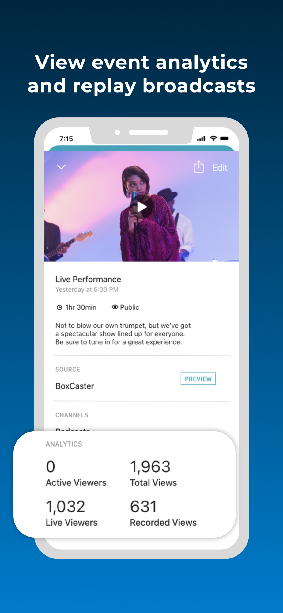 • View event analytics and replay past broadcasts