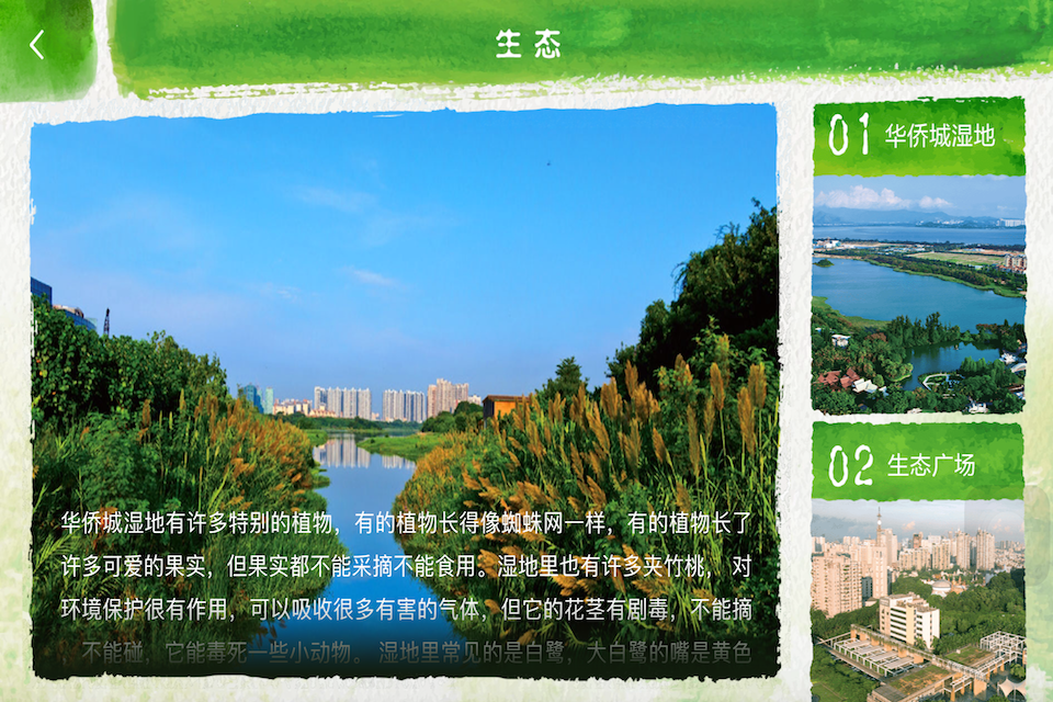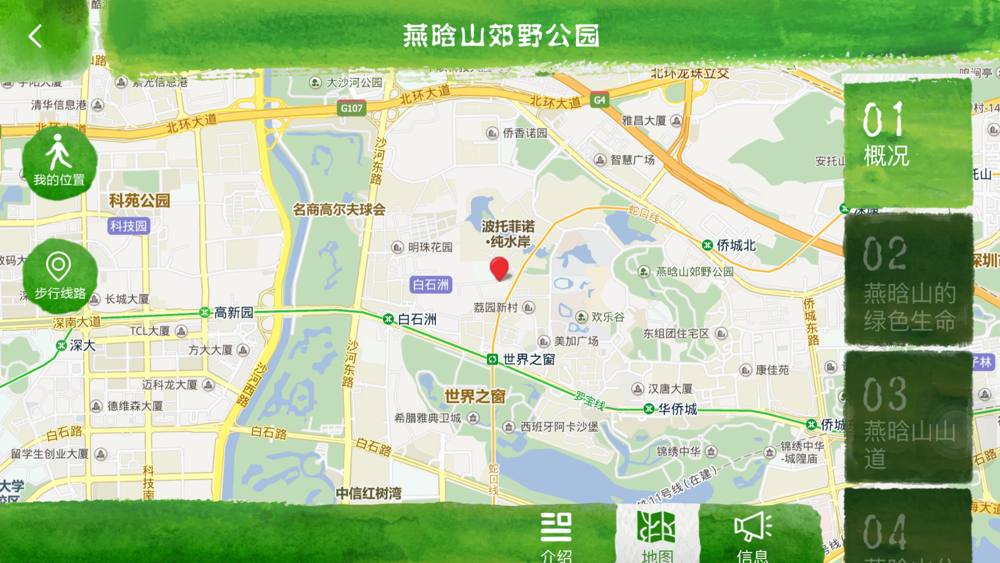 本APP以国内首本绿色城区漫步手册——《漫步华侨城》为蓝本制作,内容主要包括“生态”、“文艺”、“乐活”、“漫游”、“地图”五大板块内容,并结合熟人带路、精心手绘、大师建筑、漫游路