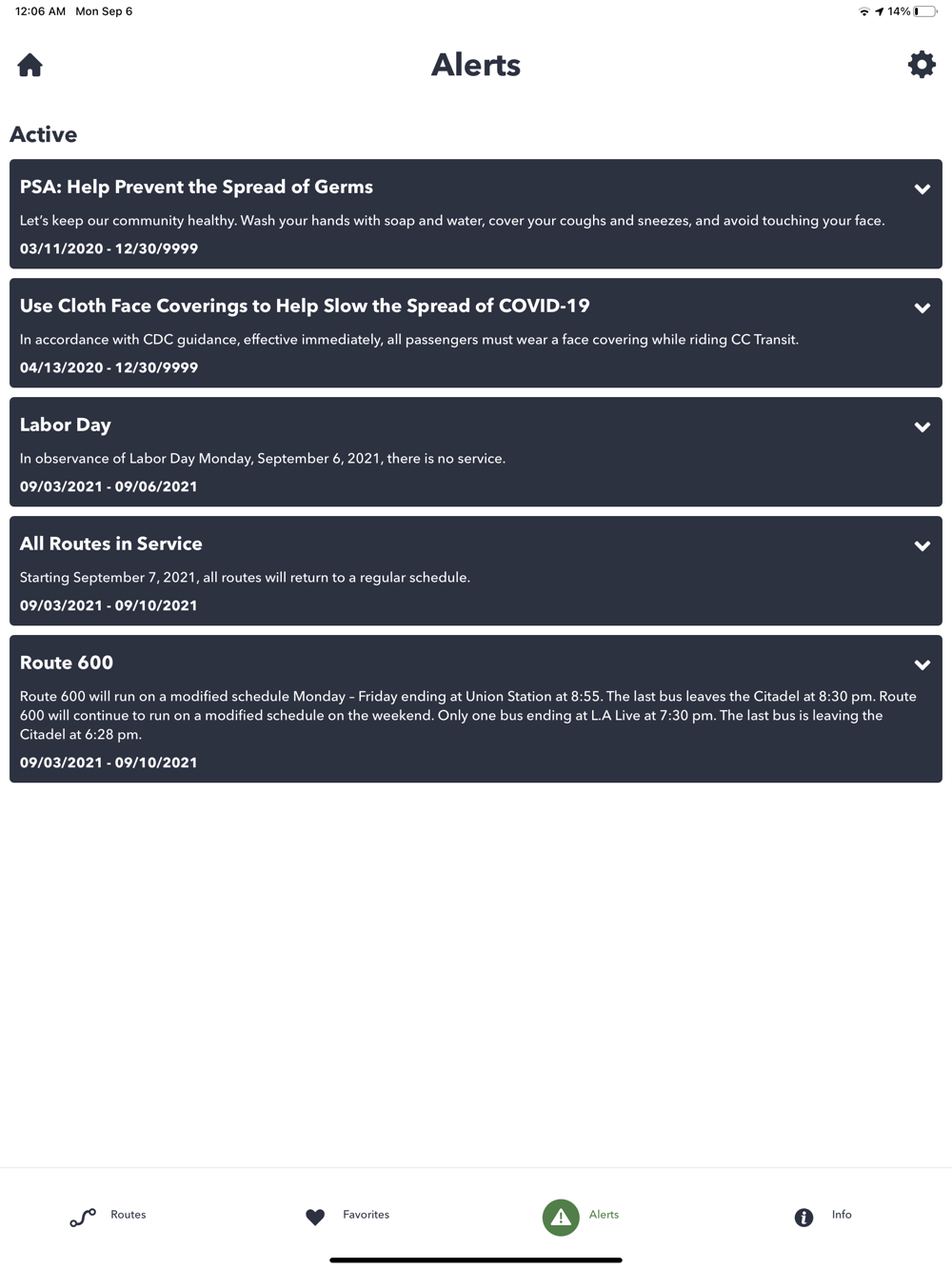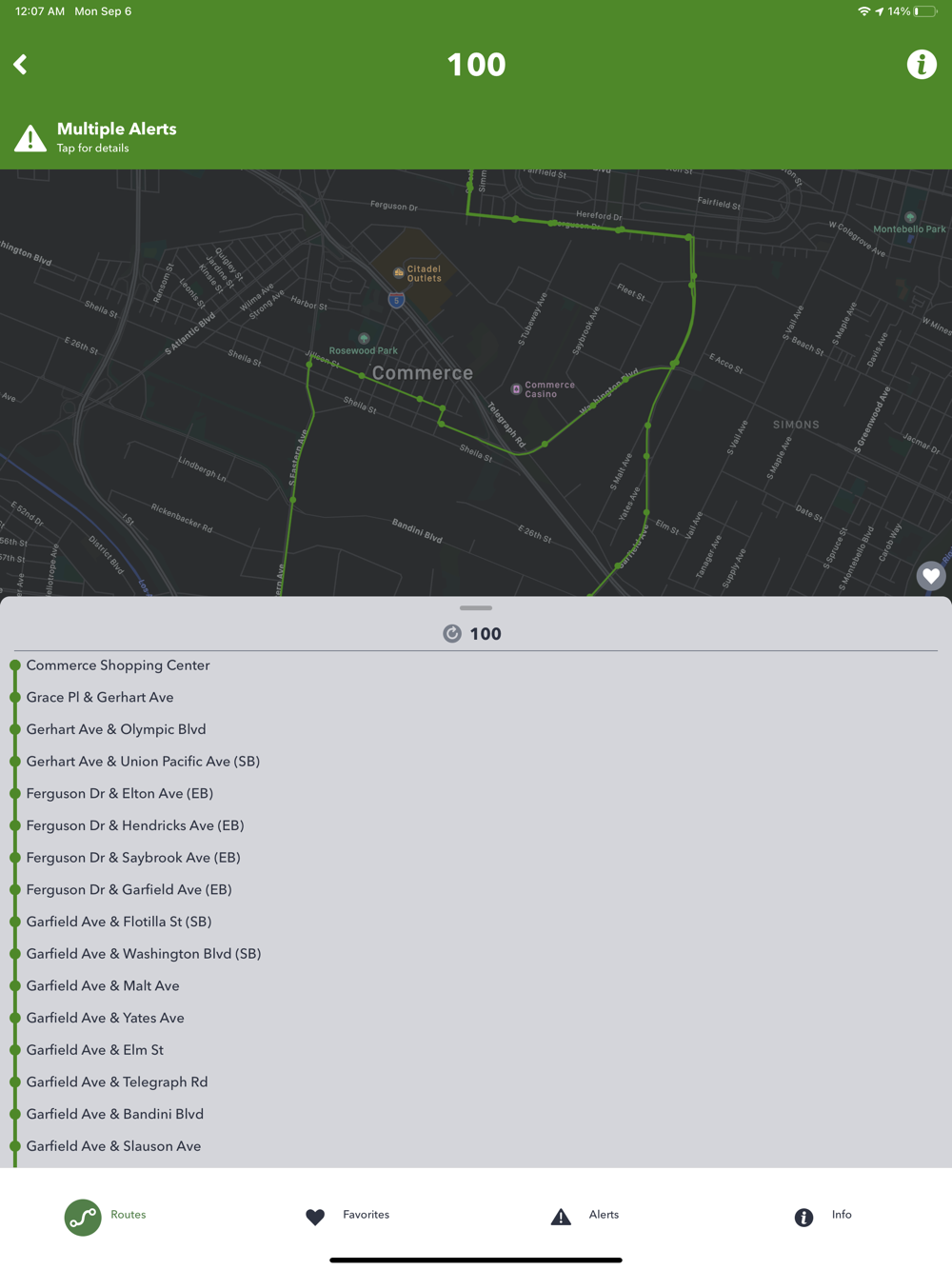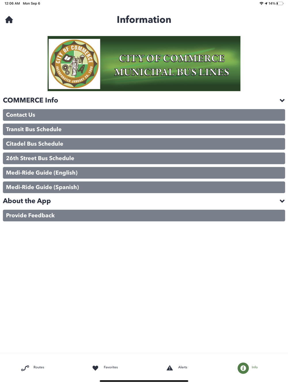 No more wondering if you missed your bus. Take the guess work out of planning your trip through the City of Commerces app. The CC Transit app provides real-time arrival information for City of Commerce Transit (CC Transit). Use the app to mark favorite stops, set reminders, get alerts, plan your trip, provide feedback and access general information about CC Transit. Best of all, you can track your bus in real-time on the live map to see its exact location and receive estimated arrival times at your bus stop. This app is fun, easy to use and best of all its FREE! Features: o Locate nearby bus stops; o Search for bus stops by tapping on the map; o Get GPS real-time information; o Get published bus schedules; o Track the current bus location; o Watch the bus live across the map; o Bookmark your favorite stops; o Get latest news and information on CC Transit app;