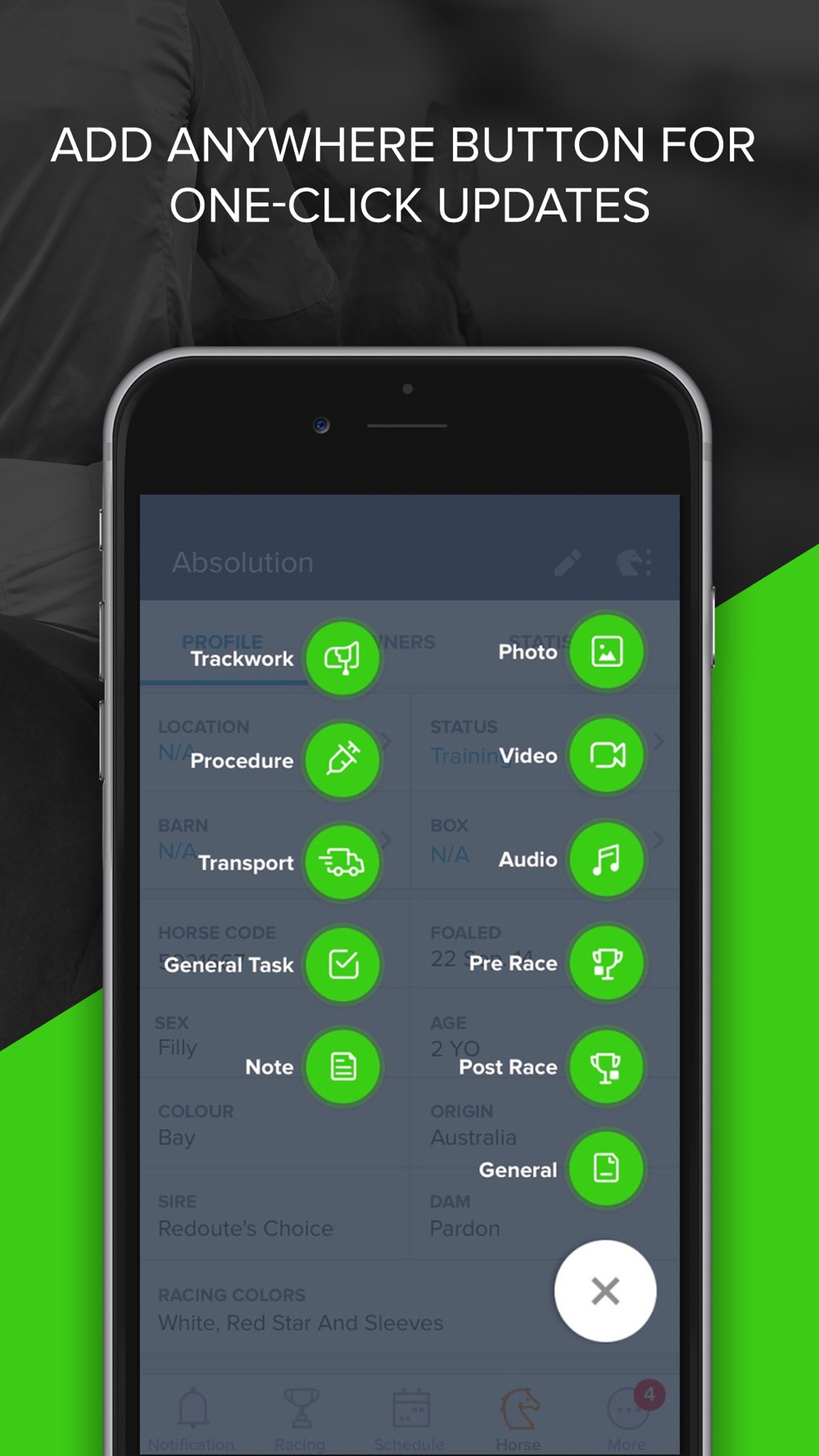 For Trainers/Syndicators/Agistment and Stud Farms, Prism enables you to manage all facets of your stable and horses including schedules, treatments and procedures, owner communications, staff management, nominations/acceptances, trackwork, finance, invoicing and payments.