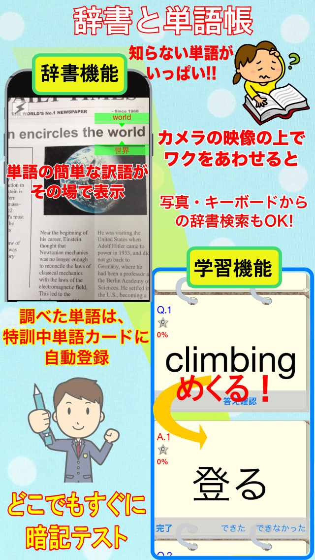 辞書と暗記帳は、英単語の意味をカメラを使って簡単に調べる辞書機能と、調べた単語を暗記帳に自動登録し、効率よく単語を勉強することのできるアプリです。