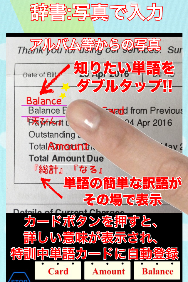 知らない単語がいくつかあったページは、そのまま写真にとってアルバムに保存しておきましょう。「写真で入力」では、保存した写真の上で、知りたい単語の部分をダブルタップすると、その単語の簡単な意味が表示されます。一つの写真で複数の単語を続けて調べることができます。同時に、画面の下に調べた言葉が書かれたカードボタンが表示されます。