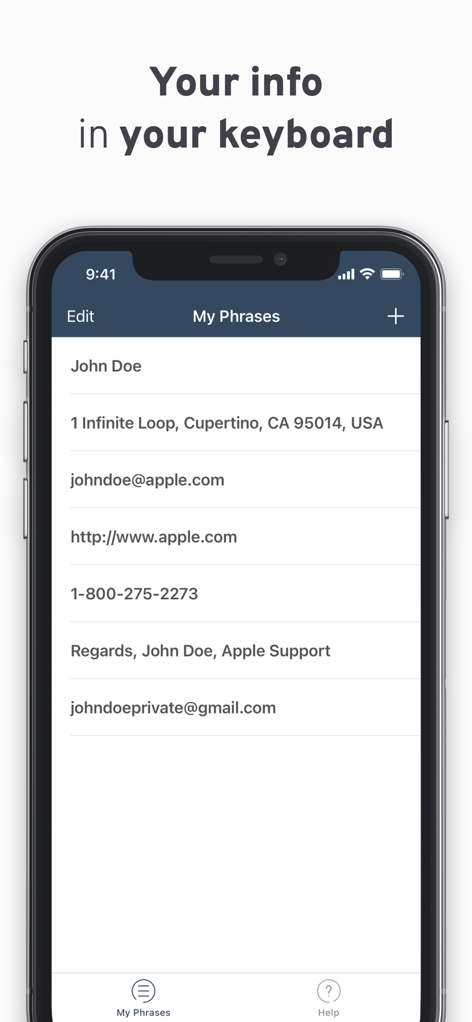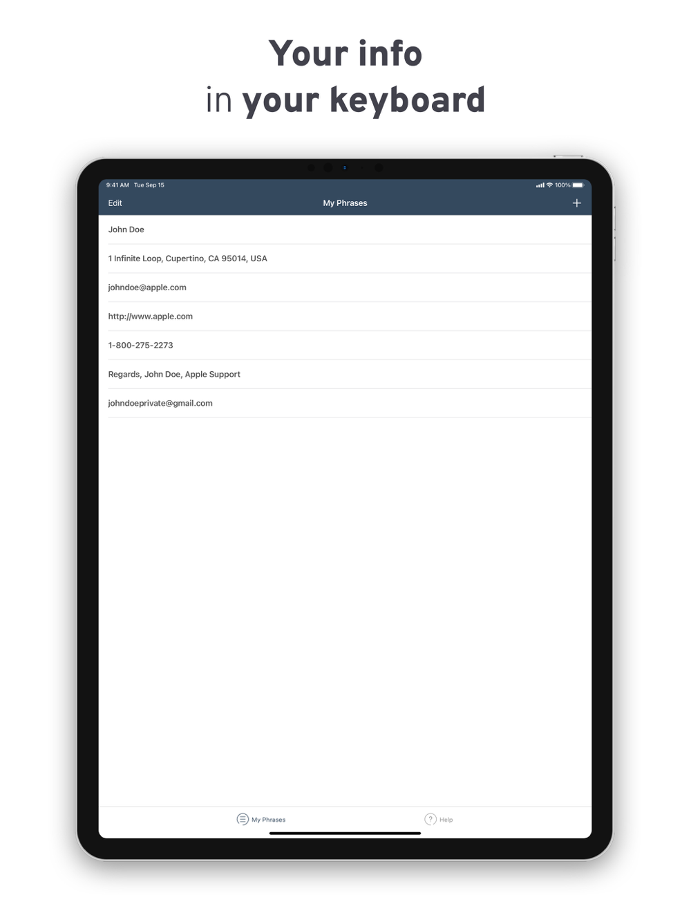 Quickly enter the information you want to save for later. Easily switch to the keyboard just like you switch to your Emojis. Insert!
