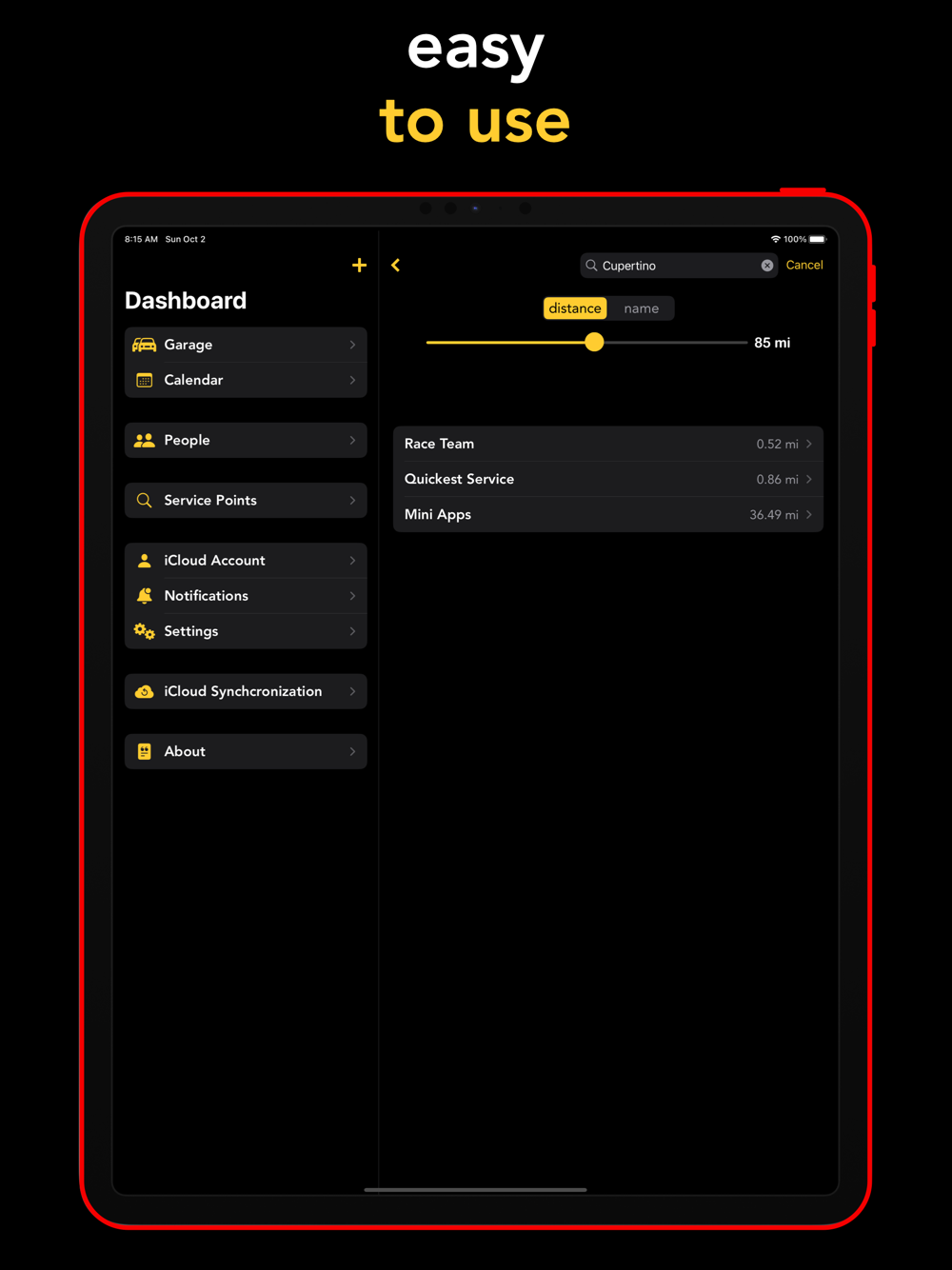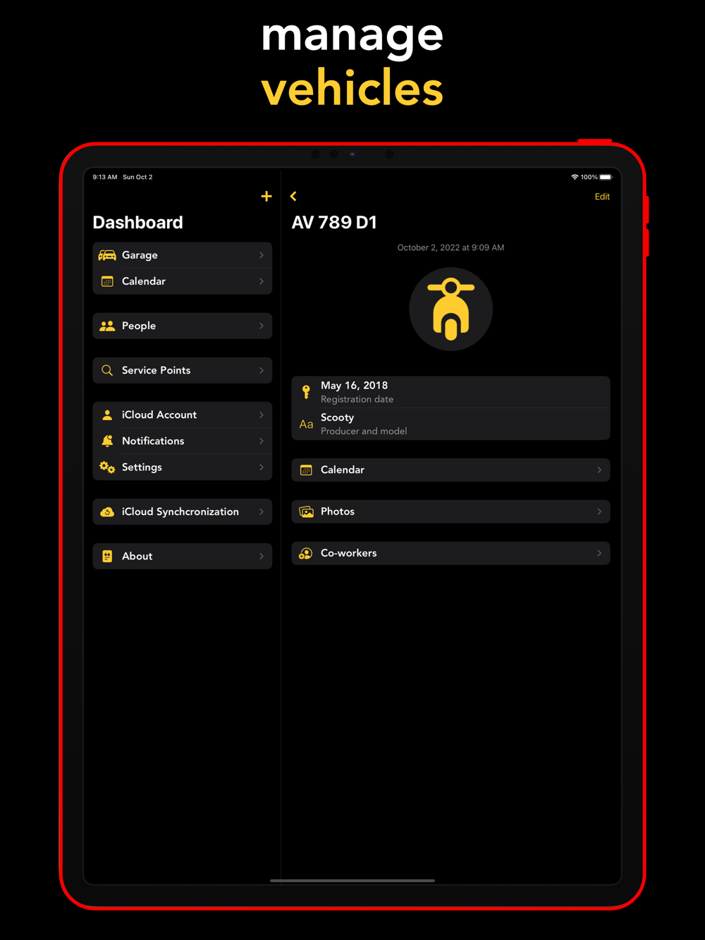 The valued functionality of the app is that you can share your vehicles with others and collaborate with them. By sharing a vehicle, you allow the co-workers to access the information about it, to see the content of the calendar and pictures or create events for you.