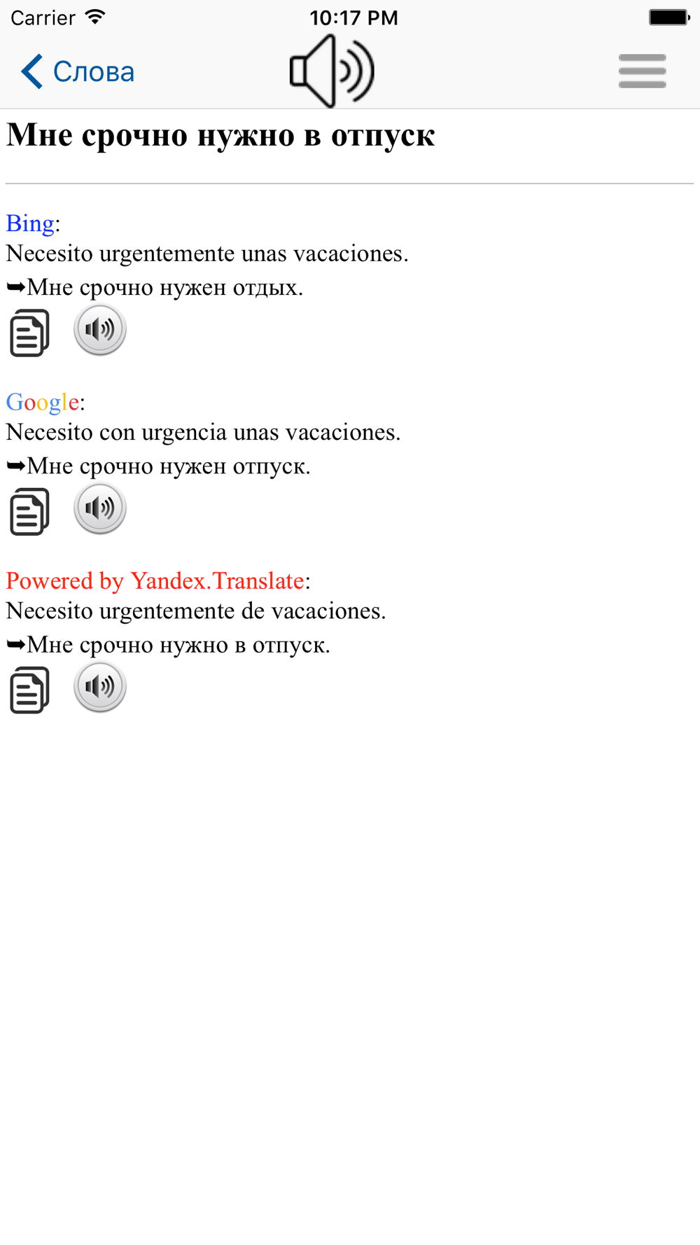 Если слово или фраза в словаре не были найдены, приложение предложит вам помощь систем перевода Bing, Google и Yandex: одновременно вы получите три результата на одном экране.
